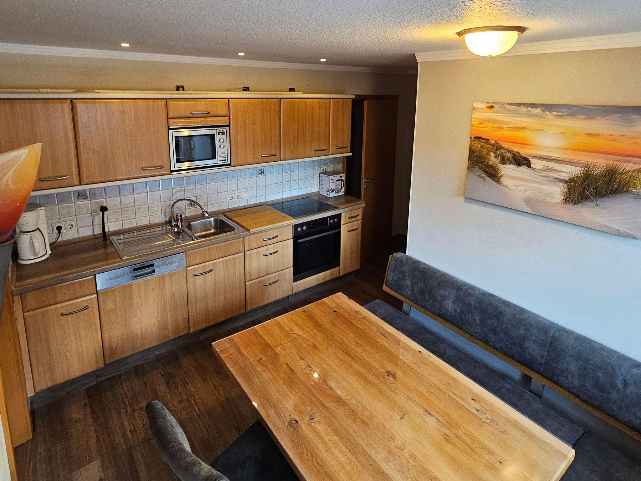 Des Weiteren erwartet Sie eine voll ausgestattete, separate Küche mit Essbereich. Hier können Sie sich mit dem Kaffeevollautomaten einen leckeren Kaffee o.ä. zubereiten oder sich einen Tee aufbrühen.