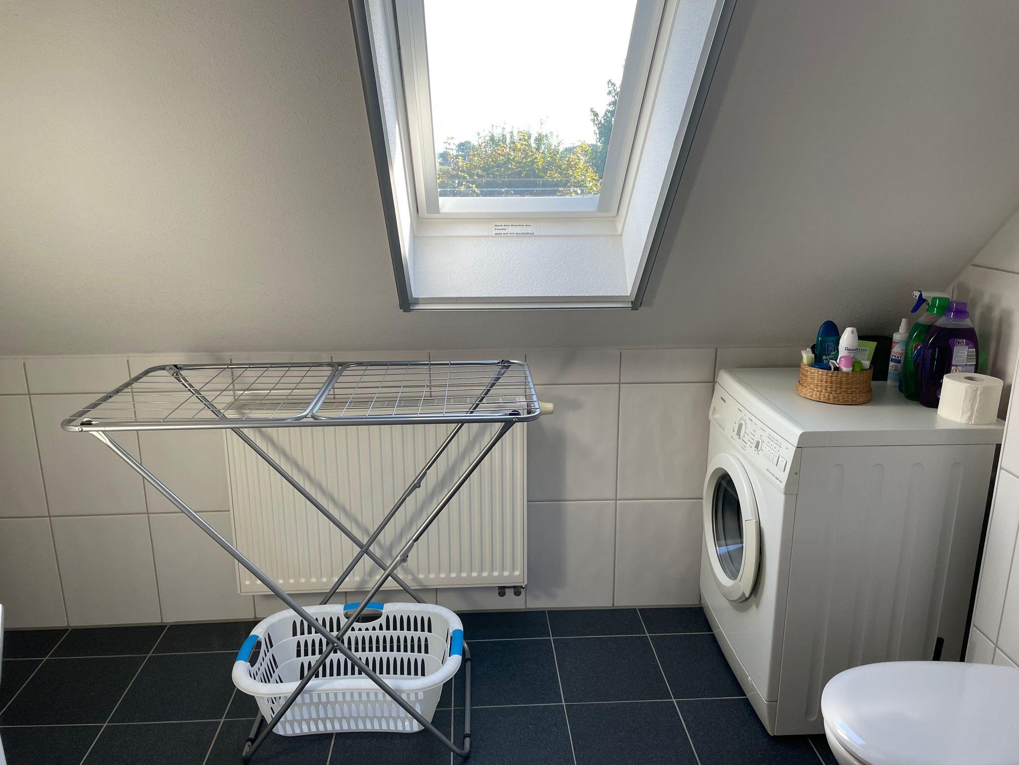 • Im Bad finden sie eine Waschmaschine plus Wäscheständer und Wäschekorb