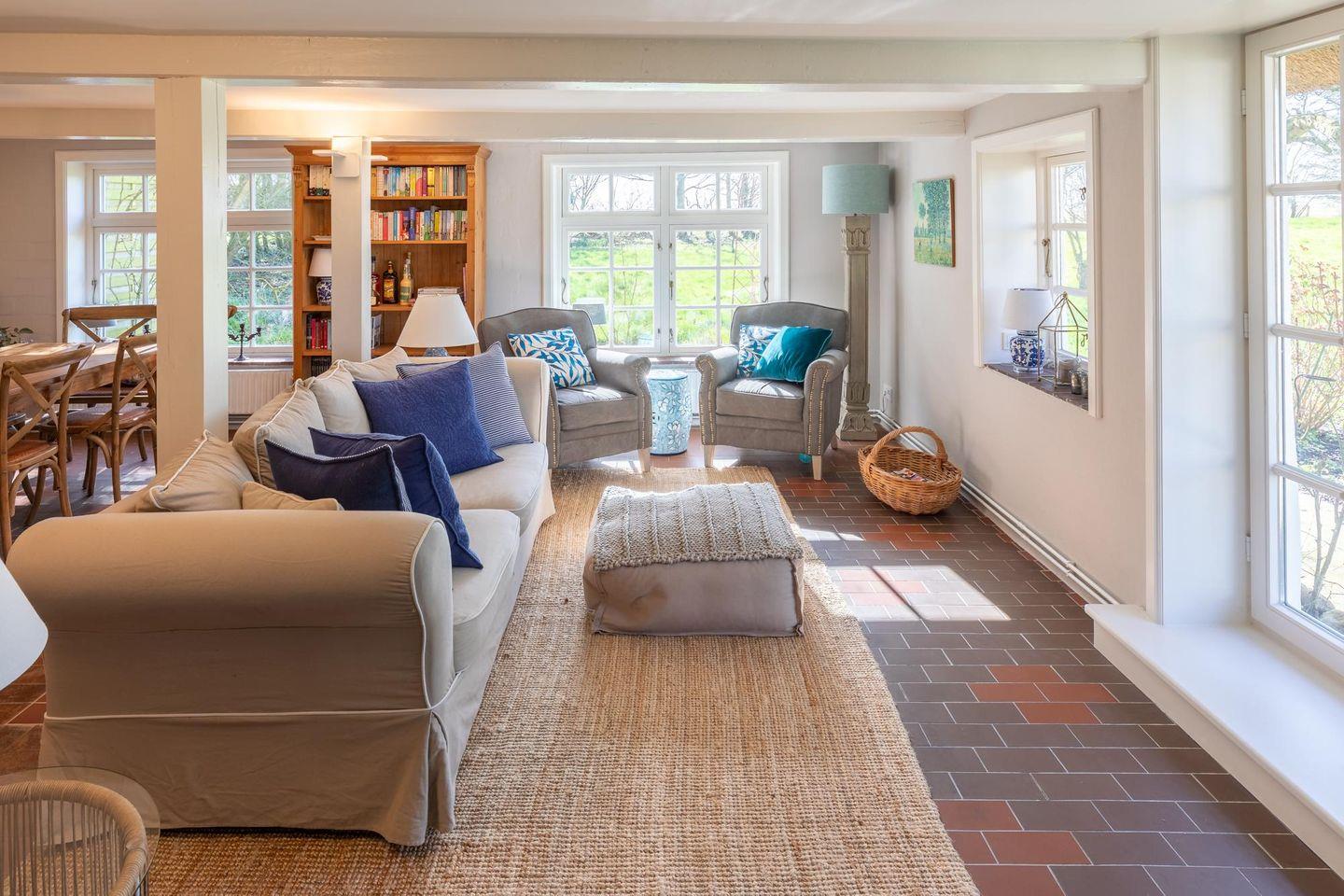 Das liebevoll sanierte Reetdachhaus kombiniert einen gemütlichen Landhausstil mit modernen Elementen. Der offen gestaltete Ess- und Wohnzimmerbereich mit integrierter Küche gestaltet das Erdgeschoss großzügig. Die neue, gut ausgestattete Küche mit Kücheninsel verfügt über ein Cerankochfeld und einen Geschirrspüler. Gleichzeitig erzeugt der gusseiserne, schwedische Ofen im Wohnzimmer eine gemütliche Atmosphäre. Das Erdgeschoss beinhaltet zudem ein Schlafzimmer mit Doppelbett sowie zwei moderne Duschbäder mit Fußbodenheizung. Zwei weitere Doppelbettschlafzimmer befinden sich im Obergeschoss. Alle Betten im Haus haben eine Breite von 1,60 m.