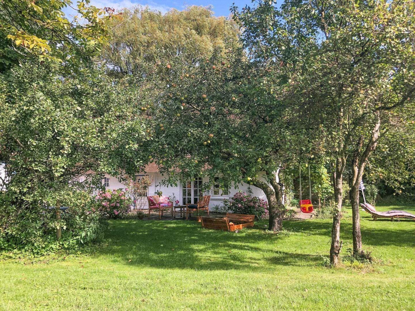 Durch die großen Fenster und die Terrassentür im Wohnzimmer hat man einen unverstellten Blick in den großen Garten. Der naturbelassene Garten mit 2.500 qm und zahlreichen alten Obstbäumen – u. a. Apfel-, Birnen-, Kirsch-, Mirabellen- und Pflaumenbäumen – ist ein wahres Bullerbü für Groß und Klein. Kinder haben viel Platz zum Spielen und Austoben. Zwei Terrassen mit Gartenmöbeln bieten genügend Platz, um den ganzen Tag frische Nordsee-Luft und Ruhe zu genießen.
