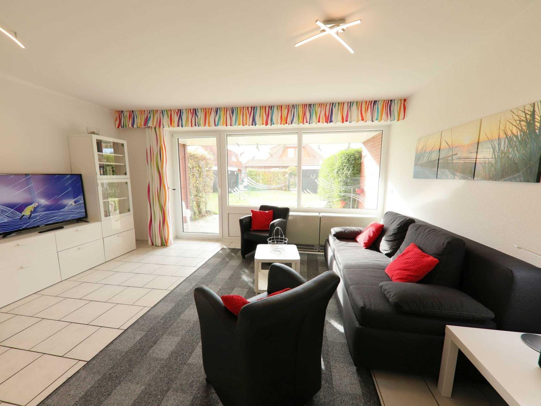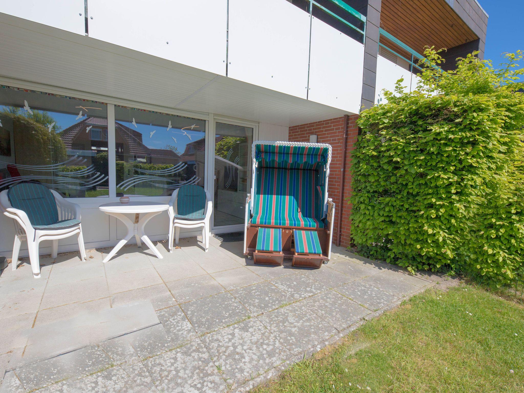Die barrierefreie Ferienwohnung Strandmuschel in Schillig bietet modernen Komfort mit Garten und Strandnähe.