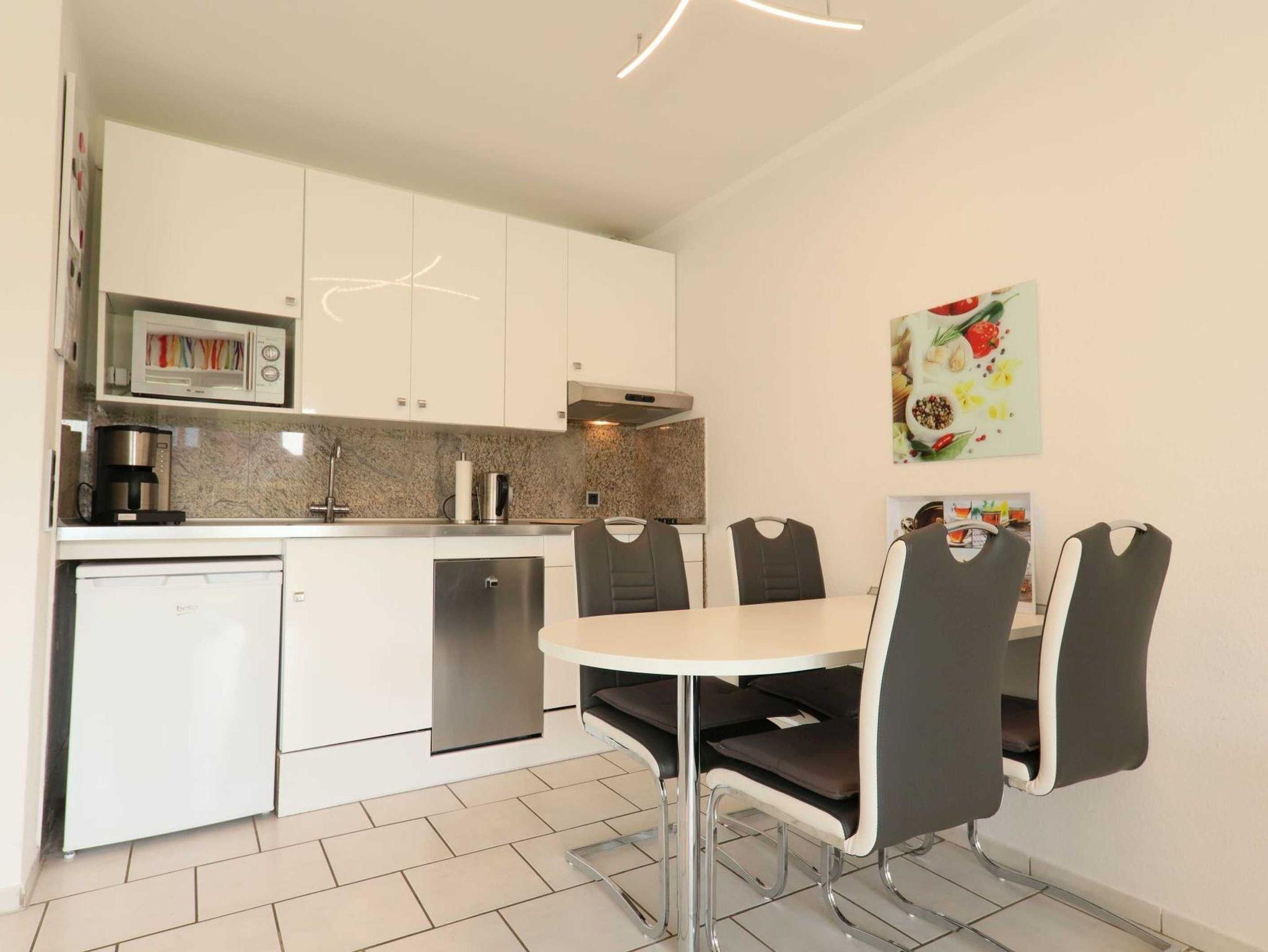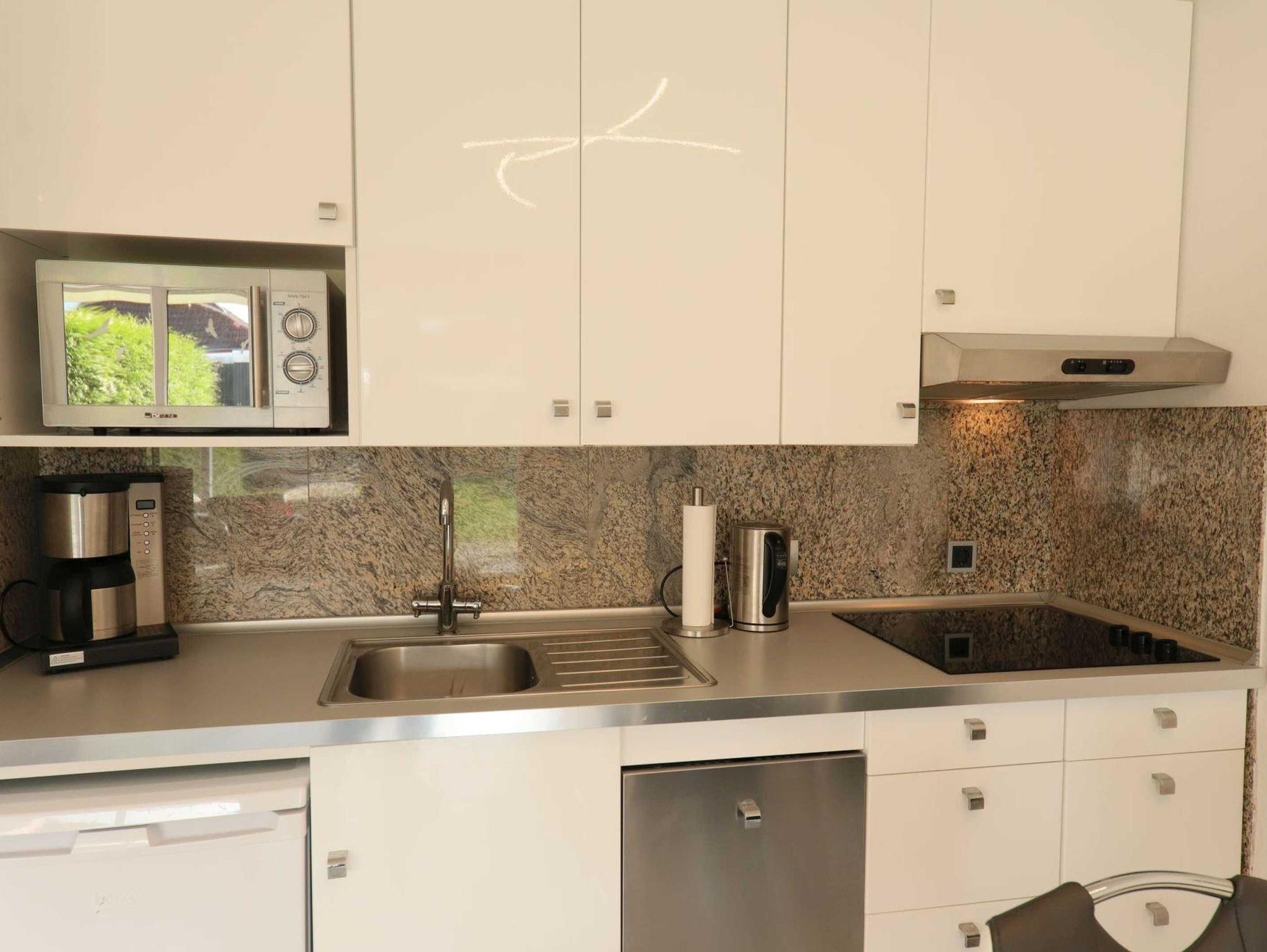Die Küchenzeile ist mit einer Kaffeemaschine, Toaster, Wasserkocher, einem Geschirrspüler, einer Mikrowelle mit Grillfunktion sowie einem Kochfeld ausgestattet.