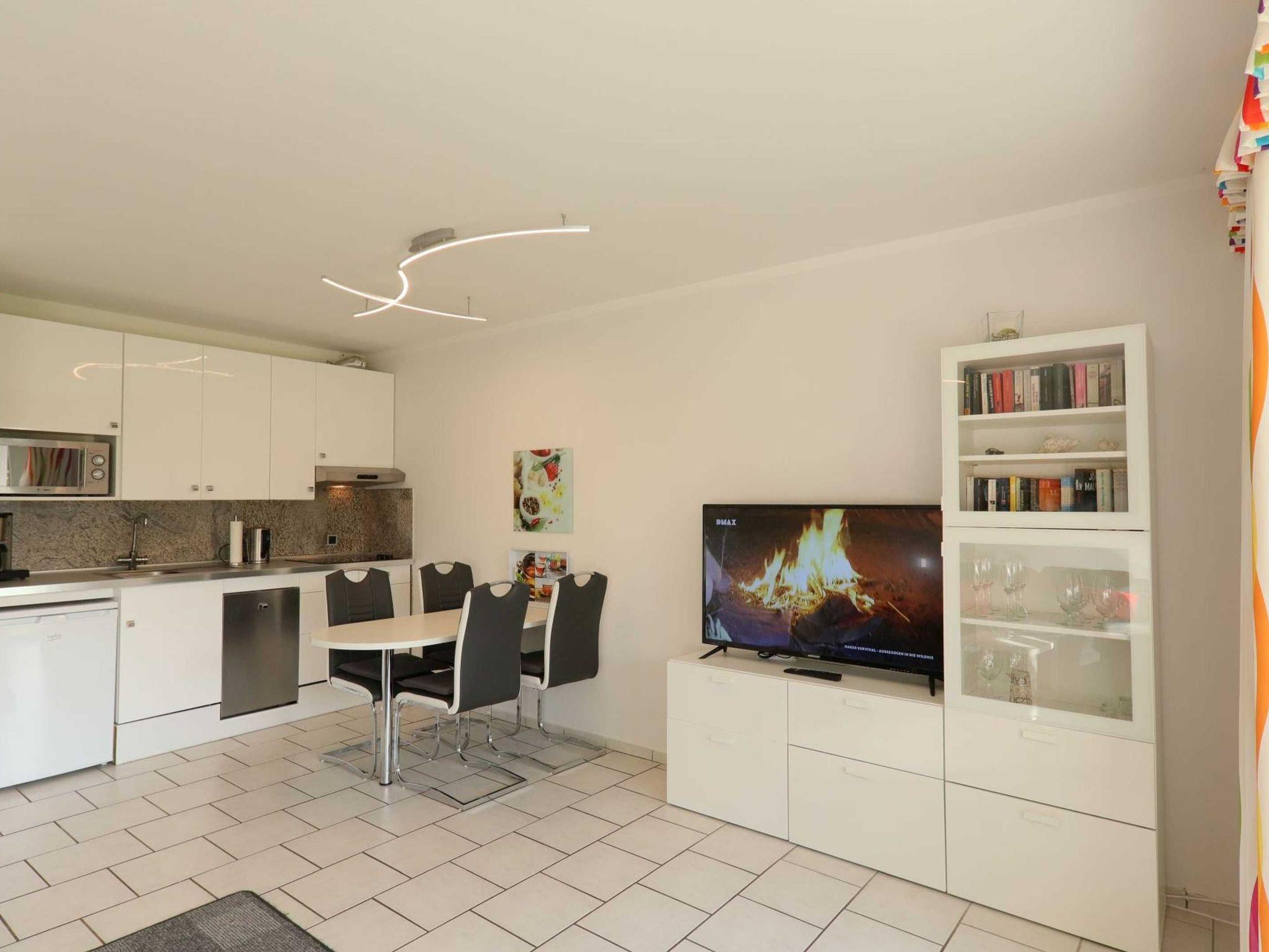Die ebenerdige Ferienwohnung Strandmuschel verfügt über ein separates Schlafzimmer mit zwei Einzelbetten sowie einer Schlafcouch im Wohnzimmer mit offener Küche und Essplatz. Desweiteren verfügt die Ferienwohnung über ein Badezimmer mit Dusche und einen Abstellraum.