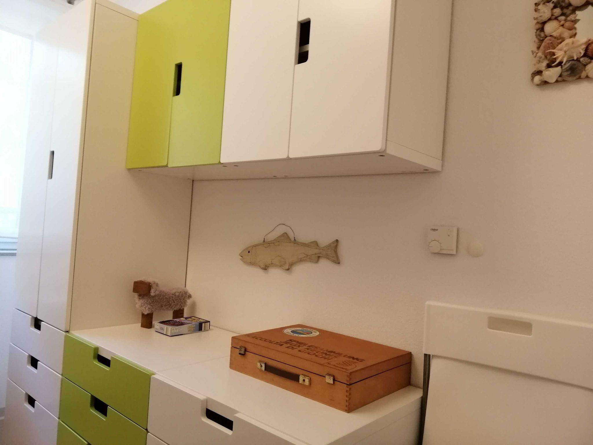 Das ebenerdige Ferienhaus verfügt über zwei Schlafzimmer, einem Wohnzimmer mit offener vollausgestatteter Küche und direktem Zugang auf die Terrasse und den eingezäunten Garten sowie einem Abstellraum mit Waschmaschine und abschließbarem Fahrradraum.
