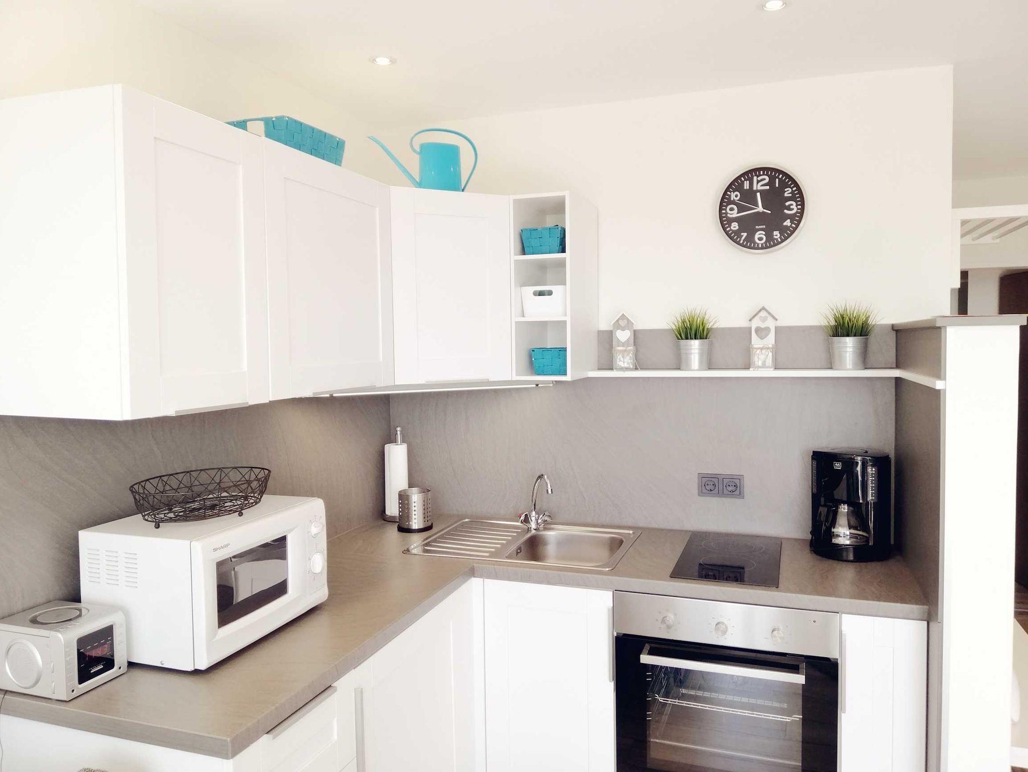 Der hell und freundlich eingerichtete Wohnraum verfügt über einen Essplatz für 4 Personen, eine offene vollausgestattete Küche mit einem Backofen, Kochfeld mit zwei Feldern, Mikrowelle sowie einem Kühlschrank mit Gefrierfach, Filter-Kaffeemaschine sowie Senseo-Pad-Maschine, Toaster und Wasserkocher. Dem Wohnbereich mit Schlafsofa und Fernseher schließt sich der sonnige Balkon an.