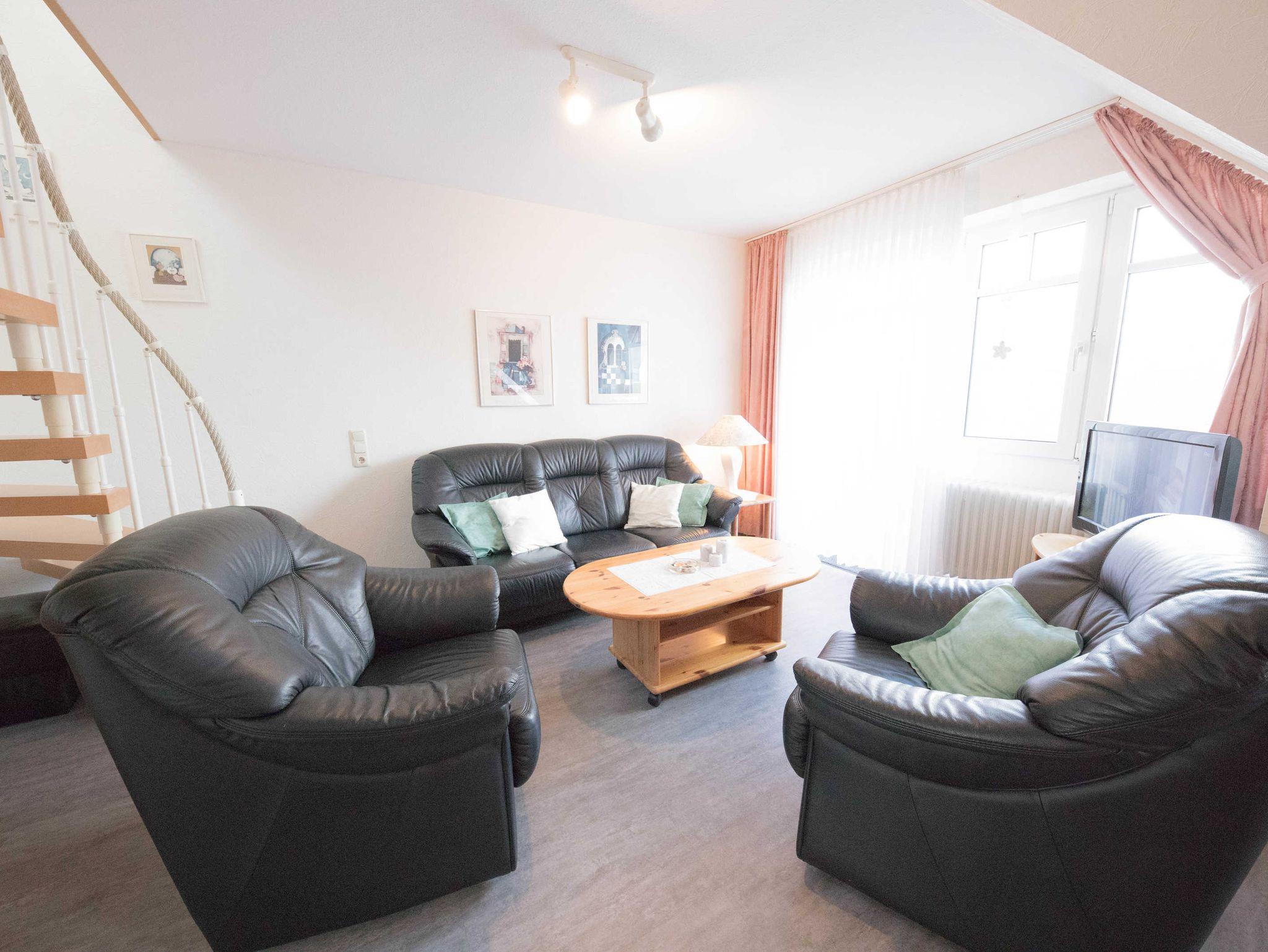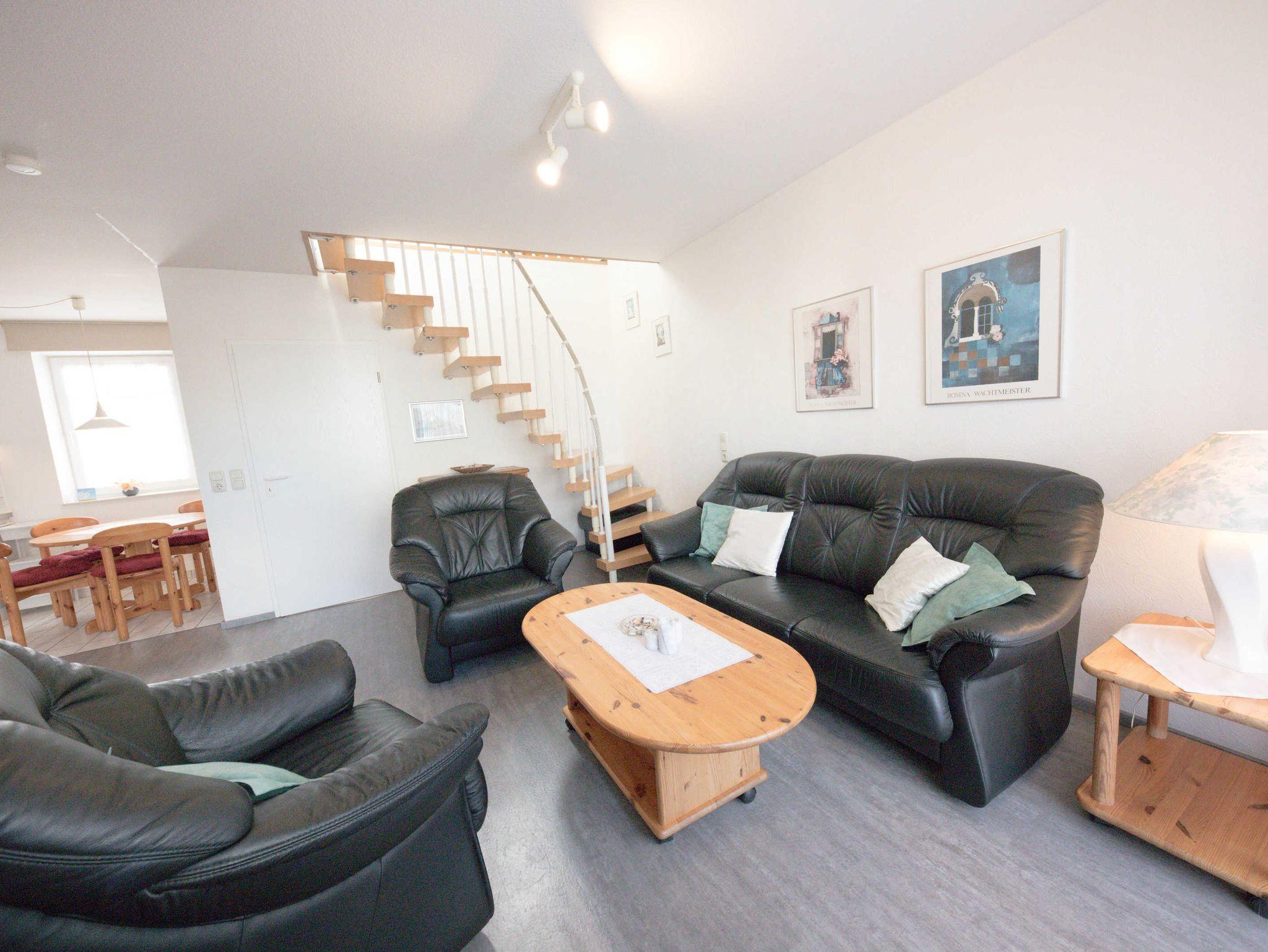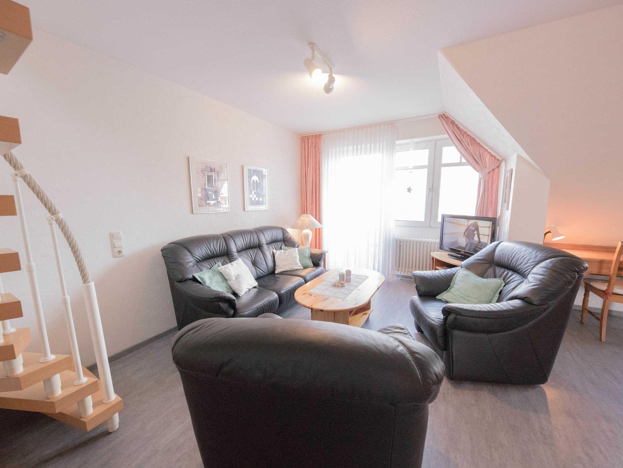 Gemütliches, voll ausgestattetes Appartment für 4 Personen, zentral aber trotzdem ruhig gelegen ca. 200 m vom großen Sandstrand entfernt ... Das Appartment liegt im 2 OG am Ende des Laubengangs. In der unteren Ebene gelangen Sie über den Flur in einen großen Wohnschlafraum , mit gemütlicher Sitzgruppe und einer Schrankwand in der ein Doppelbett integriert ist, eine komplette Küche mit 4 Plattenkochfeld, Mikrowelle, Kühlschrank, Toaster, Wasserkocher und Kaffeemaschine und dert Essecke und ein Bad mit Dusche.Vom Balkon aus haben Sie einen direkten Blick auf die Nordsee, Über eine Treppe gelangen Sie in den oberen, separaten Schlafraum,in dem sich zwei Einzelbetten befinden und eine kleine Spielecke für die Kinder.