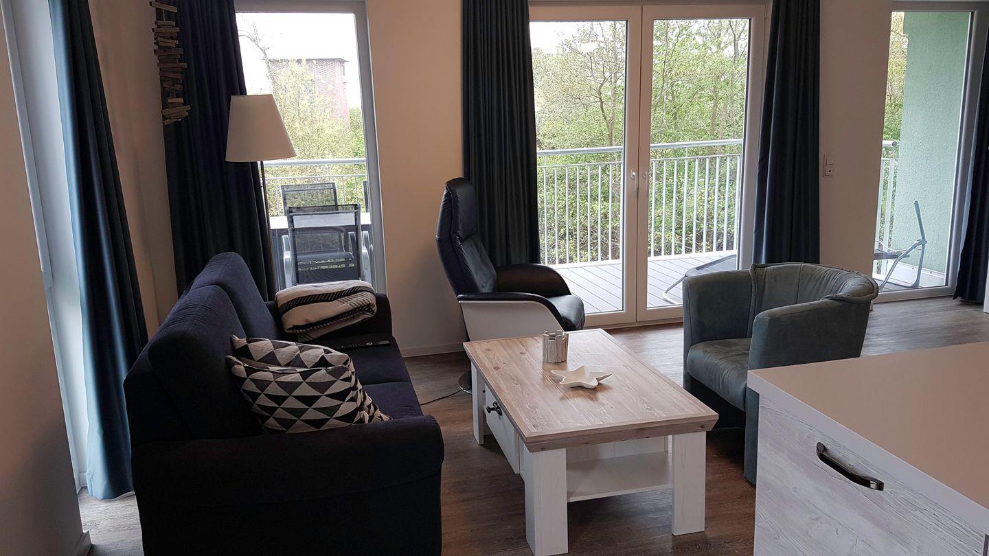 Im Apartment sind zwei Fernseher mit Satellitenempfang vorhanden. In jedem Schlafzimmer stehen Ihnen ein Doppelbett mit Nachtkonsolen und ein Kleiderschrank zur Verfügung. Die Einrichtung ist modern und hochwertig. An stürmischen oder regnerischen Tagen wird das Badezimmer mit Sauna, ebenerdiger Dusche und Badewanne zum Wellnessbereich, der den nötigen Komfort für die Erholung bietet. Ein möblierter Balkon mit Strandkorb lädt zum Verweilen ein. Ein Kleinkinderreisebett und ein Kinderhochstuhl sind ebenfalls vorhanden.