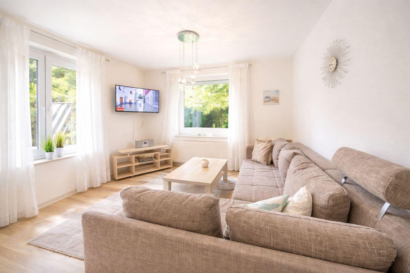 Das helle und sonnige Wohnzimmer ist der zentrale Treffpunkt der Wohnung. Hier laden bequeme Möbel zum Verweilen ein, während ein Flachbildfernseher mit DVD-Player für Unterhaltung sorgt. Der integrierte Essplatz bietet Raum für gemeinsame Mahlzeiten, Spieleabende oder gesellige Stunden. Ein besonderes Highlight ist der direkte Zugang zur Terrasse, auf der Ihnen ein eigener Strandkorb zur Verfügung steht. Genießen Sie hier im Sommer ein entspanntes Frühstück im Freien, lassen Sie sich von der Sonne verwöhnen oder lassen Sie den Tag in ruhiger Atmosphäre ausklingen.