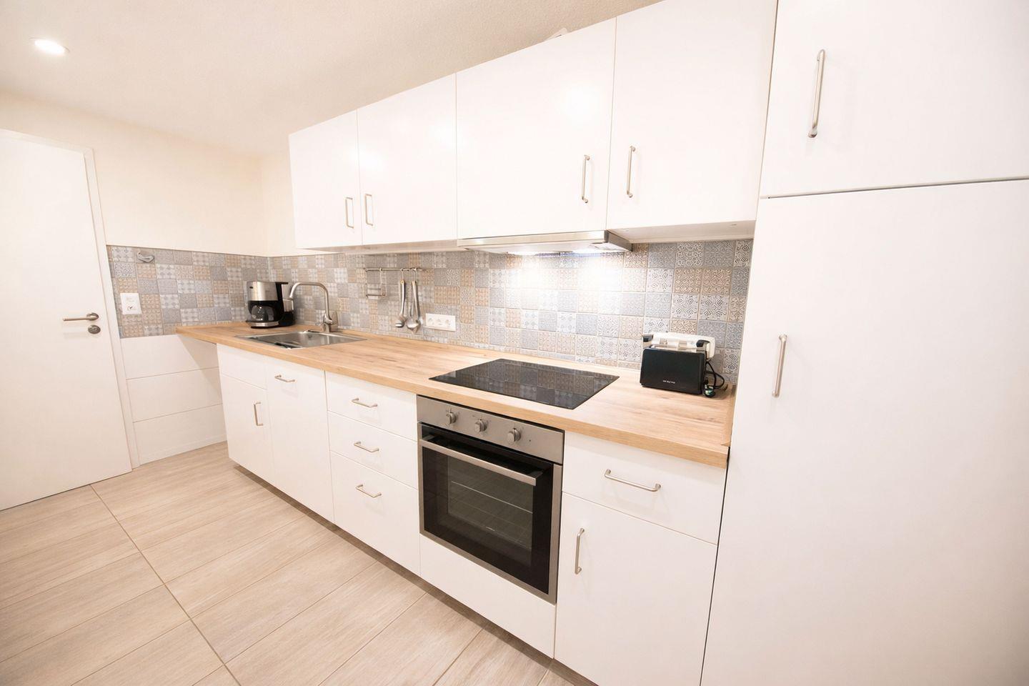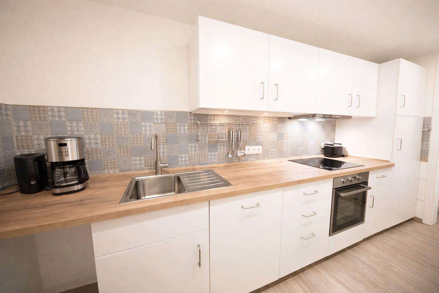 Die separate, gut ausgestattete Küche lässt keine Wünsche offen und bietet alles, was Sie für die Selbstversorgung im Urlaub benötigen. Backofen, Cerankochfeld, Kühlschrank mit Gefriermöglichkeit, Mikrowelle, Kaffeemaschine, Wasserkocher und Toaster sorgen dafür, dass vom gemütlichen Frühstück bis zum gemeinsamen Abendessen alles mühelos gelingt. Zwei hell und freundlich gestaltete Schlafzimmer bieten komfortable Rückzugsmöglichkeiten. Eines ist mit einem gemütlichen Doppelbett ausgestattet, das zweite mit zwei Einzelbetten und eignet sich perfekt für Kinder oder Mitreisende. Zusätzlich verfügt das Wohnzimmer über ein Schlafsofa, das bei Bedarf weiteren Platz zum Übernachten bietet.