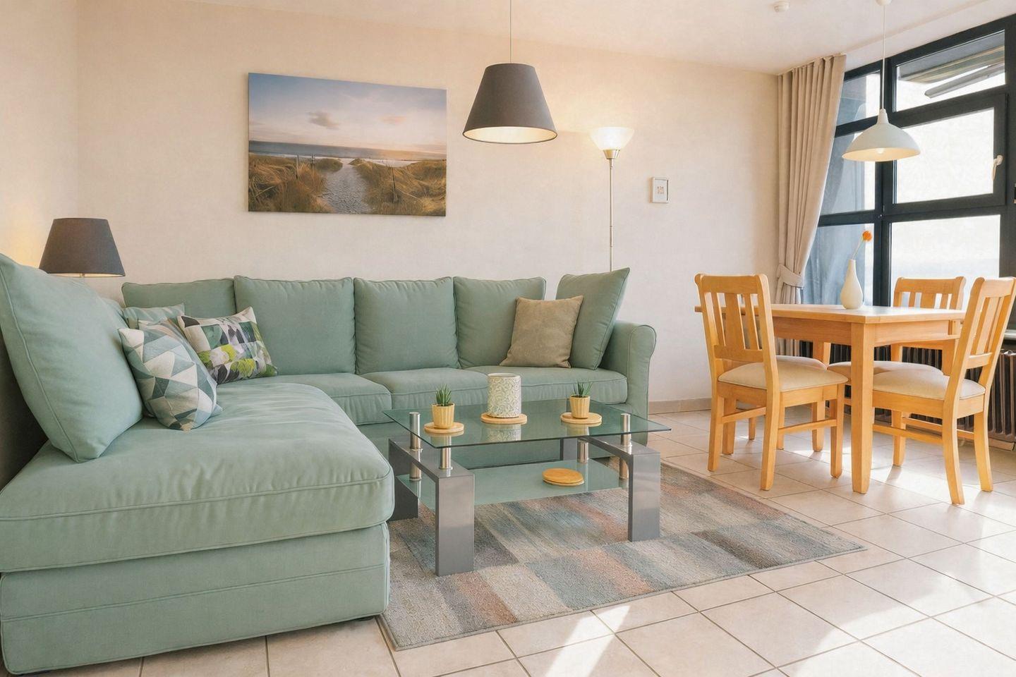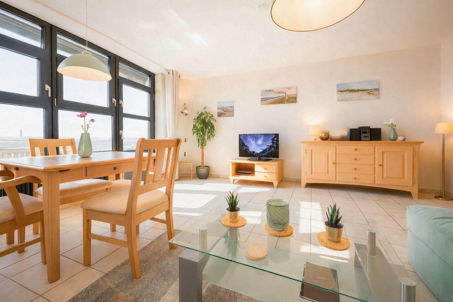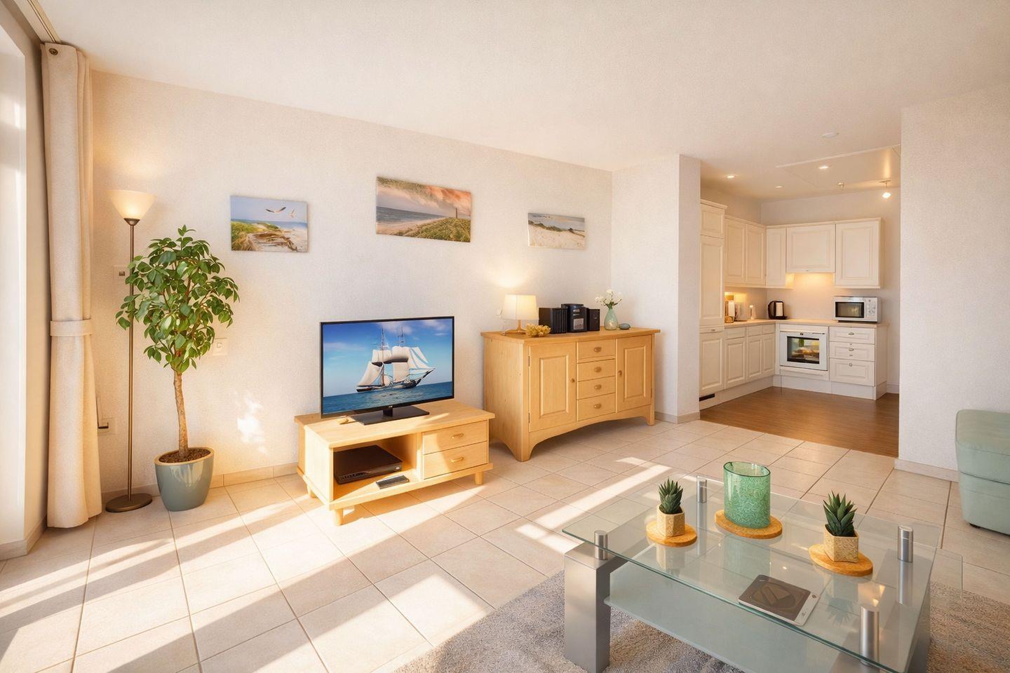 Der Wohnbereich ist großzügig geschnitten und dank großer Fenster angenehm hell. Eine gemütliche Sitzgruppe bietet ausreichend Platz und lädt zu gemeinsamen Fernsehabenden, Spieleabenden oder entspannten Gesprächen ein. Vorhänge ermöglichen es, den Raum abzudunkeln und eine behagliche Atmosphäre zu schaffen. Vom Wohnzimmer aus treten Sie direkt auf den sonnigen Balkon, der mit seiner Südausrichtung den perfekten Rahmen bietet, um einen schönen Nordseetag entspannt zu beginnen oder ausklingen zu lassen.