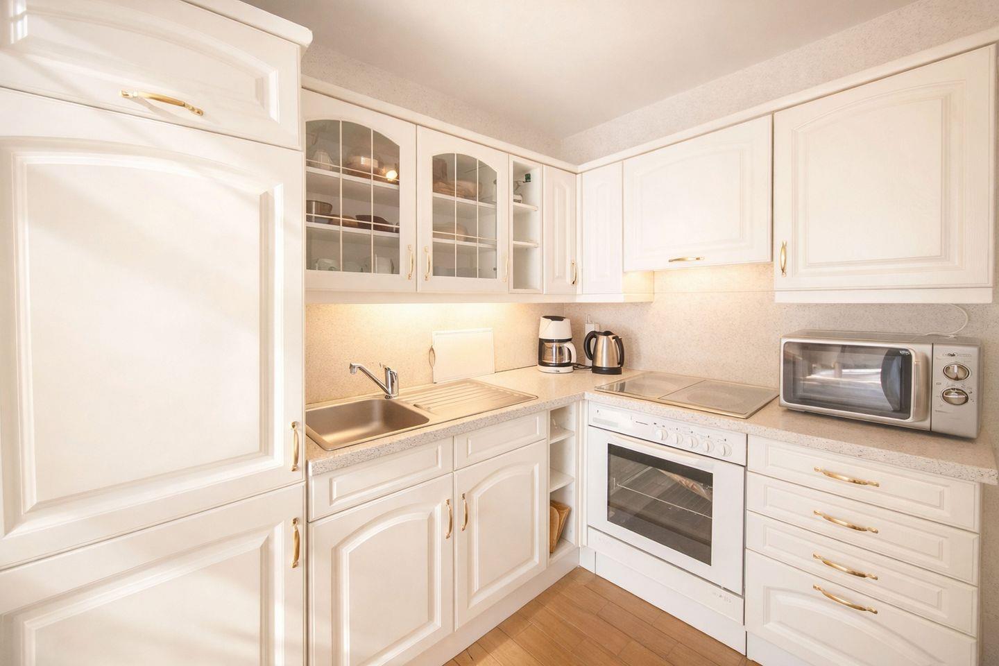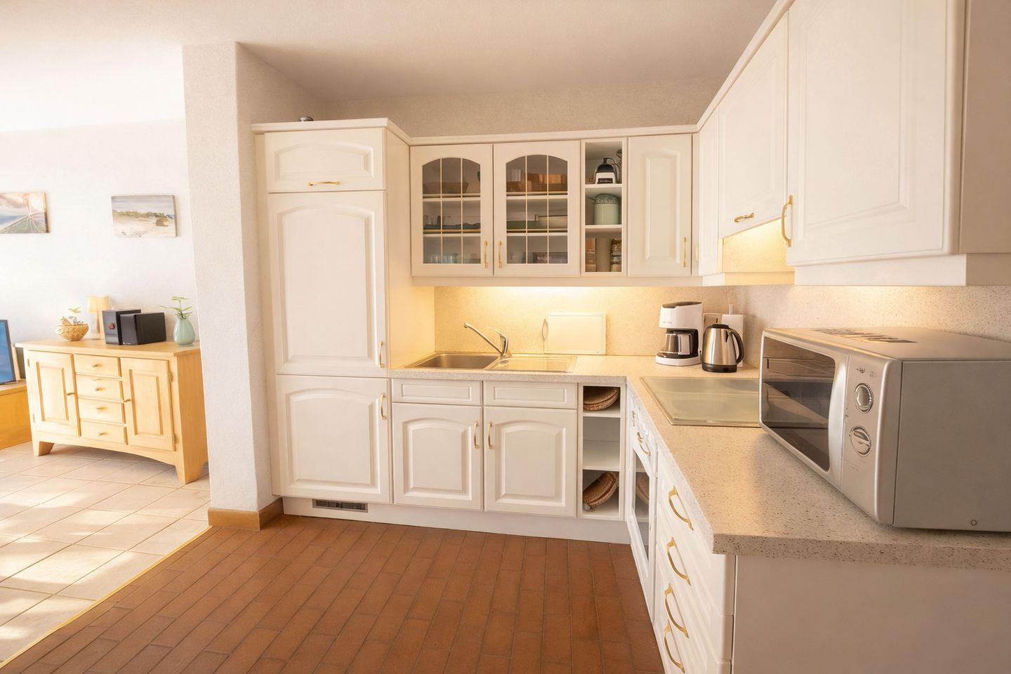 Der Grundriss der Wohnung ist durchdacht und komfortabel gestaltet. Von der Haustür aus gelangen Sie über den Windfang direkt ins Schlafzimmer, das mit einem großzügigen Doppelbett ausgestattet ist und dank hochwertiger Matratzen für erholsamen Schlaf sorgt. Über einen kleinen Durchgang mit Kleiderschrank erreichen Sie das innenliegende Badezimmer, dessen besonderes Highlight die moderne Regenwalddusche ist – ideal, um nach einem Strandtag neue Energie zu tanken. An den Durchgang schließt sich die L-förmig angelegte Küchenzeile im offenen Wohnbereich an. Diese ist umfassend ausgestattet und bietet unter anderem einen Backofen, eine Dunstabzugshaube, 4 Kochplatten, eine Mikrowelle, einen Toaster und einen Wasserkocher, sodass Sie sich im Urlaub ganz flexibel selbst versorgen können.