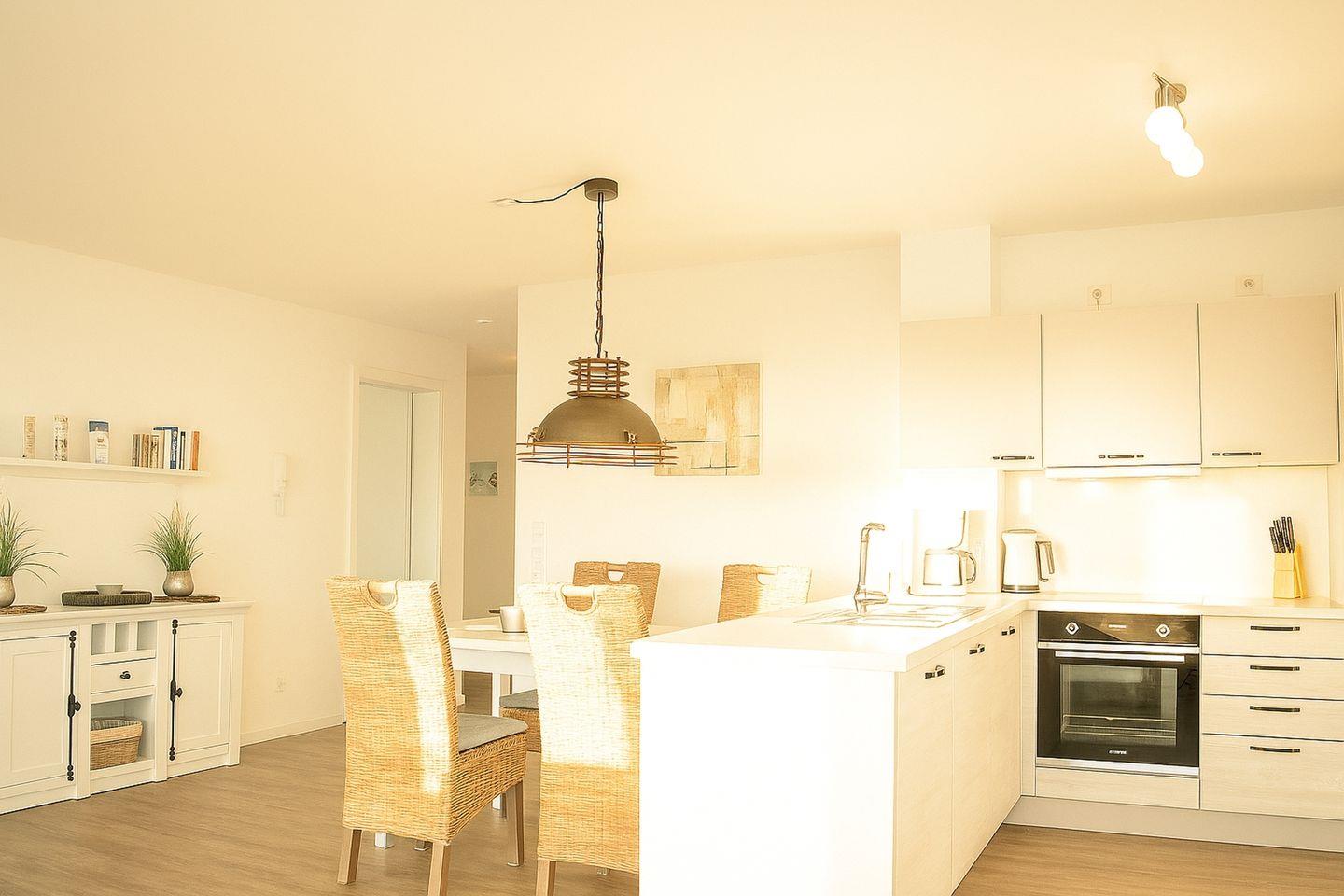Die Komfortwohnung Weitblick besticht durch ihre moderne und hochwertige Ausstattung und ihre direkte Lage am Sandstrand von Schillig. Die Ferienwohnung befindet sich in der 4. Etage des Apartmenthauses Nordsee Ferien Park Schillig (mit Fahrstuhl erreichbar) und bietet mit 80 m² 4 Personen ausreichend Platz für einen erholsamen Urlaub. Der helle Wohnraum mit gemütlichem Ecksofa und einer Liege, TV mit DVBT und DVD Player sowie einer Musikanlage verfügt über große Panoramafenster mit Blick auf Felder und einem direkten Zugang zum Balkon mit Gartenmöbeln, wo Sie die frische Nordseeluft einatmen können. Die moderne Küche mit seitlichem Meerblick ist offen im Wohnraum integriert und bietet neben einem Essplatz für 4 Personen einen Backofen, Geschirrspüler, Mikrowelle Kühlschrank mit Tiefkühlfach, Wasserkocher, Kaffeemaschine und Toaster. Dem Wohnraum schließen sich zwei Schlafzimmer mit Doppelbett sowie das großzügige Tageslicht-Badezimmer mit Badewanne und WC sowie einer Sauna an. Die Ferienwohnung verfügt über Fußbodenheizung. Ein eigener PKW-Parkplatz steht den Gästen zur Verfügung. Auch steht Ihnen kostenfrei ein Strandkorb während der Saison zur Verfügung. Es gibt im Haus einen Gemeinschaftsraum mit Münz-Waschmaschine- und Trockner. Zum Strand sind es nur wenige Gehminuten. Einrichtungen des täglichen Bedarfs sind in der Nähe.