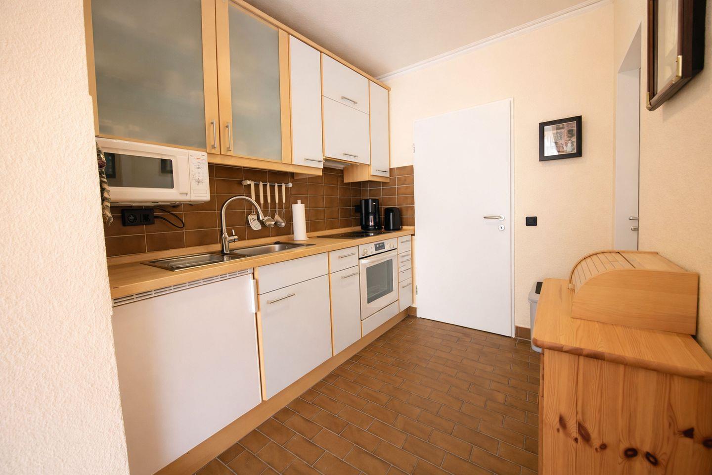 Die offen gestaltete Küche ist funktional und vollständig ausgestattet und lässt keine Wünsche offen. Sie verfügt über einen Backofen mit Ceranfeld, einen Kühlschrank mit Gefrierfach, eine Mikrowelle sowie eine Kaffeemaschine, einen Wasserkocher und einen Toaster, sodass Sie sich bequem selbst versorgen können. Direkt an die Küche schließt sich das Schlafzimmer mit einem komfortablen Doppelbett an, das erholsame Nächte garantiert. Das Badezimmer ist modern eingerichtet und mit Dusche, WC und Waschbecken ausgestattet.