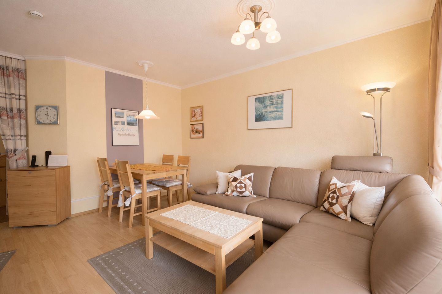 Schon beim Betreten empfängt Sie eine helle, freundliche Atmosphäre, die sofort Urlaubsstimmung aufkommen lässt. Das großzügige Wohnzimmer bietet ein gemütliches Ecksofa zum Entspannen, einen modernen Flachbildfernseher sowie einen einladenden Essplatz für gemeinsame Mahlzeiten. Von hier aus gelangen Sie direkt auf den Balkon, auf dem Sie frische Meeresluft genießen und den Tag entspannt ausklingen lassen können. Zusätzlich steht im Wohnbereich ein praktisches Schrankbett zur Verfügung, das bei Bedarf weiteren Schlafkomfort bietet.