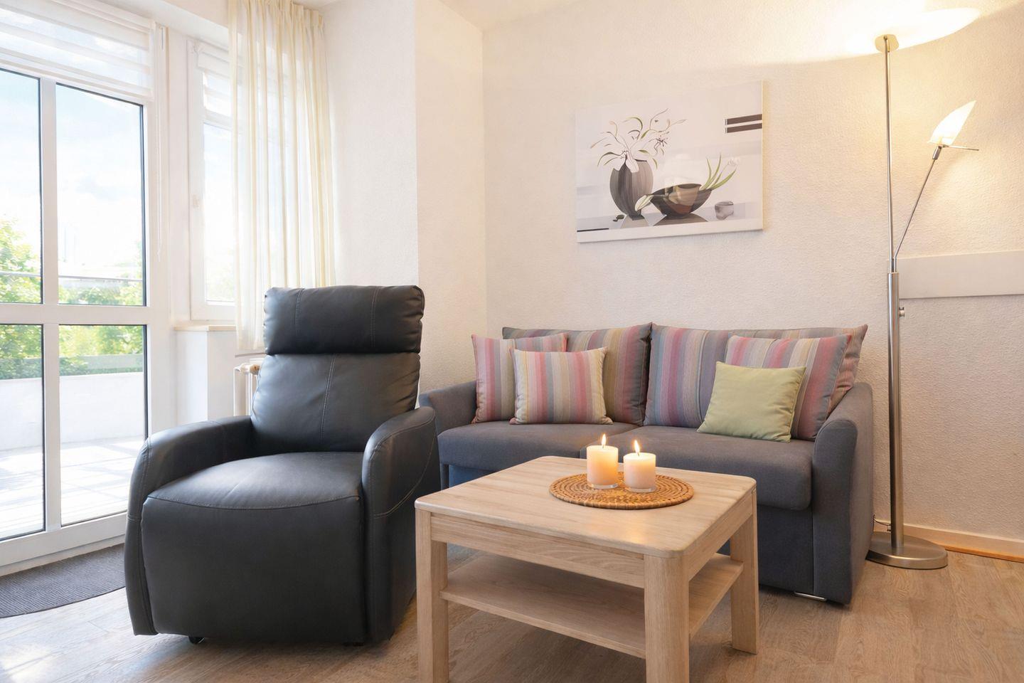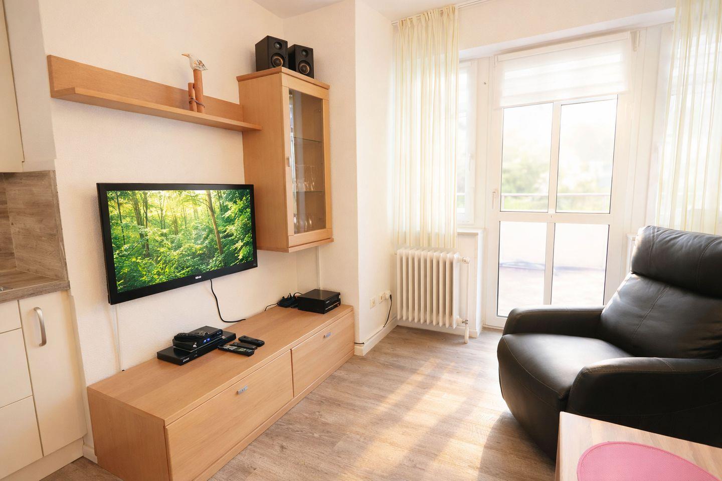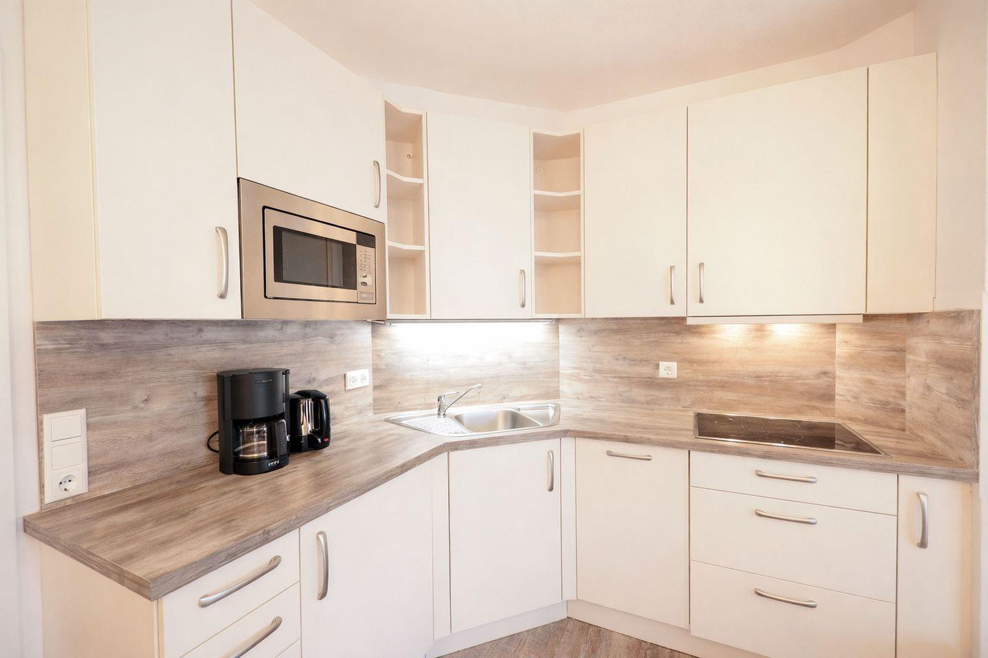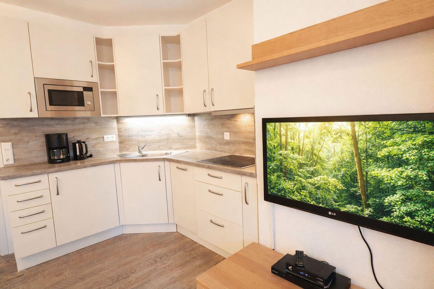 Die Wohnung verfügt über einen separaten Eingang. Der offen gestaltete Wohnbereich empfängt Sie hell und freundlich und verbindet Wohnen, Essen und Kochen zu einem harmonischen Mittelpunkt der Wohnung. Die moderne Küche ist bestens ausgestattet und lässt keine Wünsche offen. Eine Geschirrspülmaschine, ein Cerankochfeld, eine Mikrowelle, ein Toaster, eine Kaffeemaschine, ein Wasserkocher sowie eine Kühl-Gefrier-Kombination stehen Ihnen zur Verfügung, sodass Sie sich im Urlaub ganz flexibel selbst versorgen können. Der integrierte Essplatz lädt zu gemeinsamen Mahlzeiten, Spieleabenden oder gemütlichen Stunden in entspannter Atmosphäre ein.