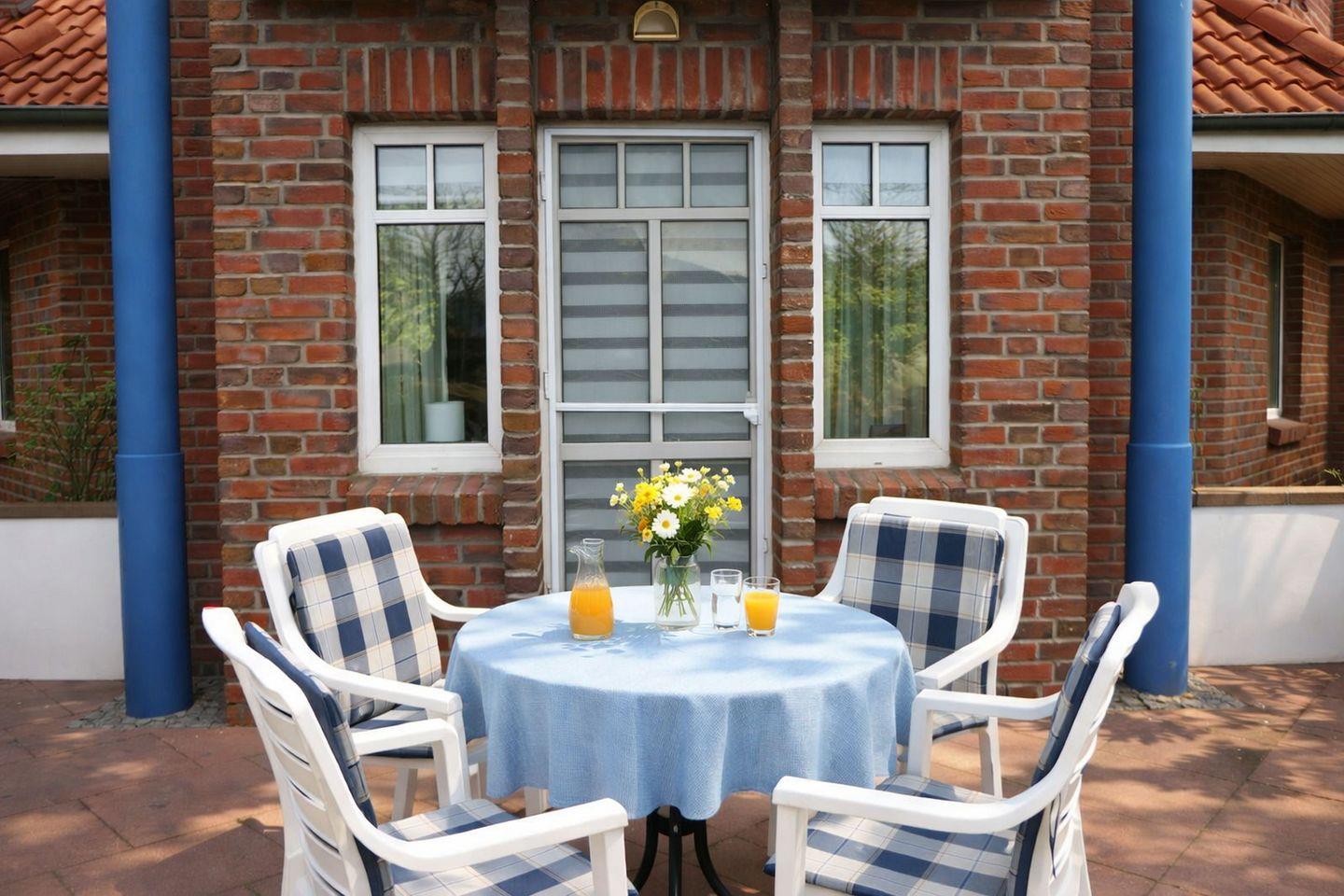 Vom Wohnbereich aus gelangen Sie direkt auf die sonnige und außergewöhnlich großzügige Terrasse, die zum erholsamen Verweilen im Freien einlädt. Hier können Sie die frische Nordseebrise bereits riechen, den Tag bei einem Frühstück an der frischen Luft beginnen oder ihn am Abend ganz entspannt ausklingen lassen. Die Terrasse bietet reichlich Platz zum Entspannen und ist ein echtes Highlight für alle, die ihren Urlaub gerne auch draußen genießen.