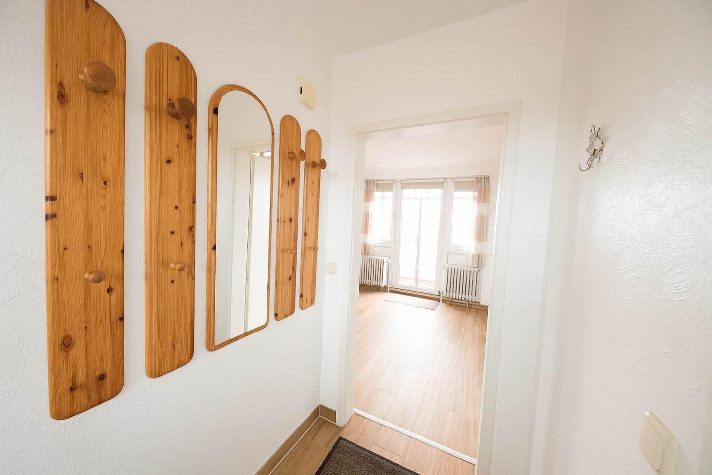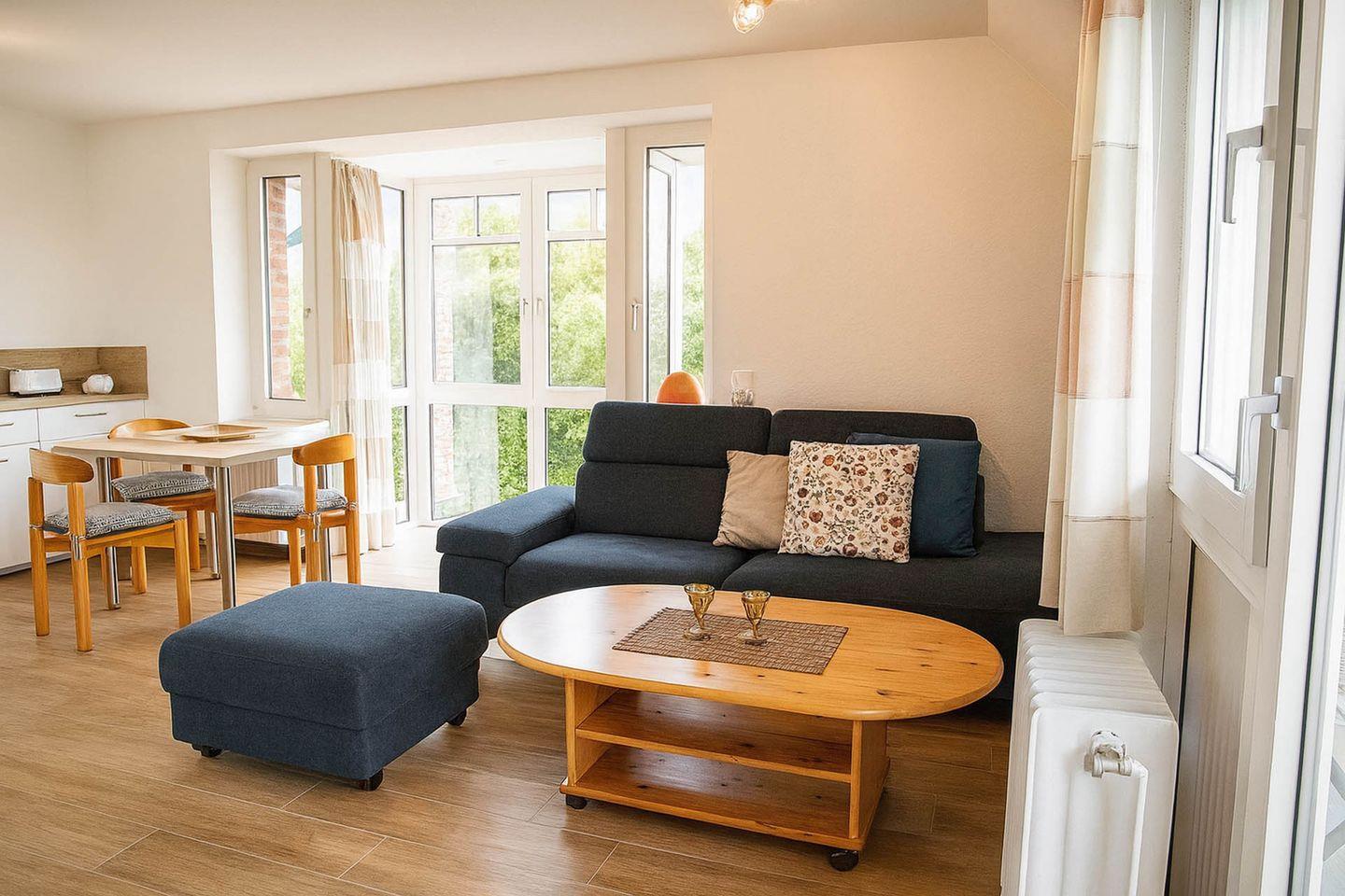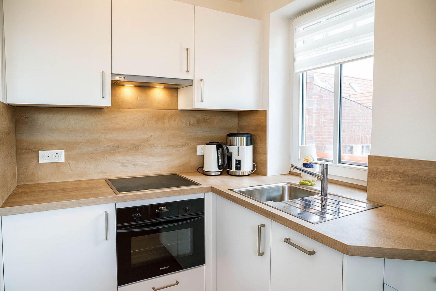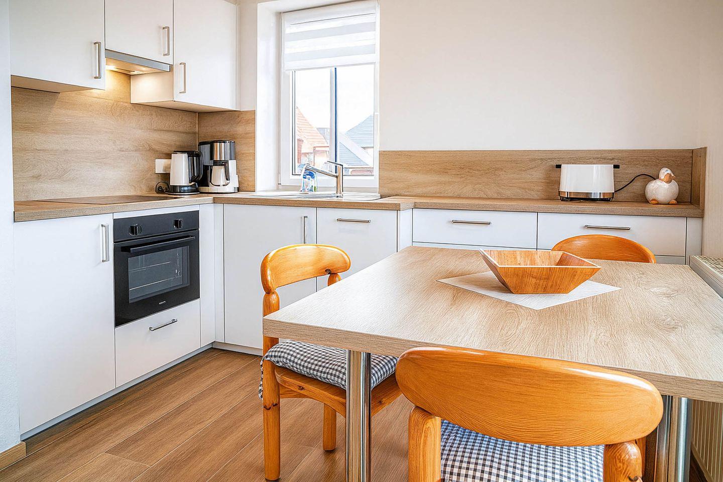 Die lichtdurchflutete, liebevoll eingerichtete Maisonettewohnung bietet auf zwei Ebenen perfekten Wohnkomfort für zwei Personen und verbindet zentrale Lage mit wohltuender Ruhe – nur etwa 250 Meter vom großen Sandstrand entfernt. Das Apartment befindet sich im zweiten Obergeschoss am Ende eines Laubengangs und empfängt Sie im unteren Bereich mit einem großzügigen Wohnraum, der durch ein gemütliches Sofa und eine moderne, vollständig ausgestattete Küche besticht. Hier stehen Ihnen ein Cerankochfeld, Backofen, Geschirrspüler, Kühlschrank mit Gefrierfach, Toaster, Wasserkocher und Kaffeemaschine zur Verfügung. Der angrenzende Essbereich lädt zu entspannten Mahlzeiten ein, während der Balkon direkt vom Wohnbereich aus erreichbar ist und den idealen Platz bietet, um den Tag in angenehmer Atmosphäre ausklingen zu lassen. Ein helles Tageslichtbad mit Dusche und WC rundet das Angebot auf dieser Ebene ab. Über eine Treppe gelangen Sie in den separaten Schlafbereich der oberen Etage, wo ein komfortables Doppelbett für erholsame Nächte sorgt. Ein eigener PKW-Stellplatz am Haus steht Ihnen ebenfalls zur Verfügung.