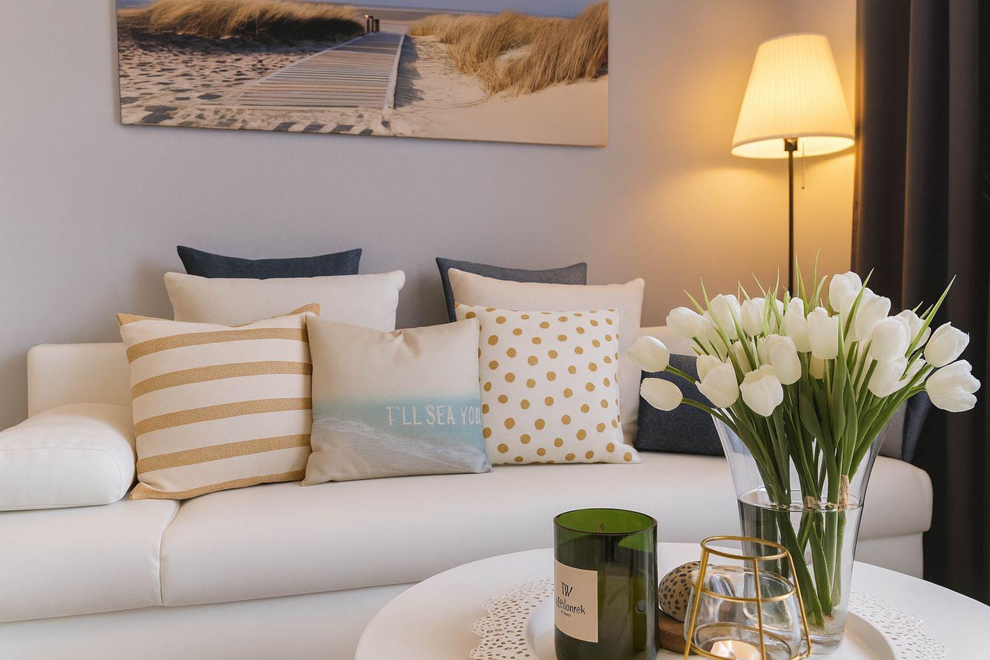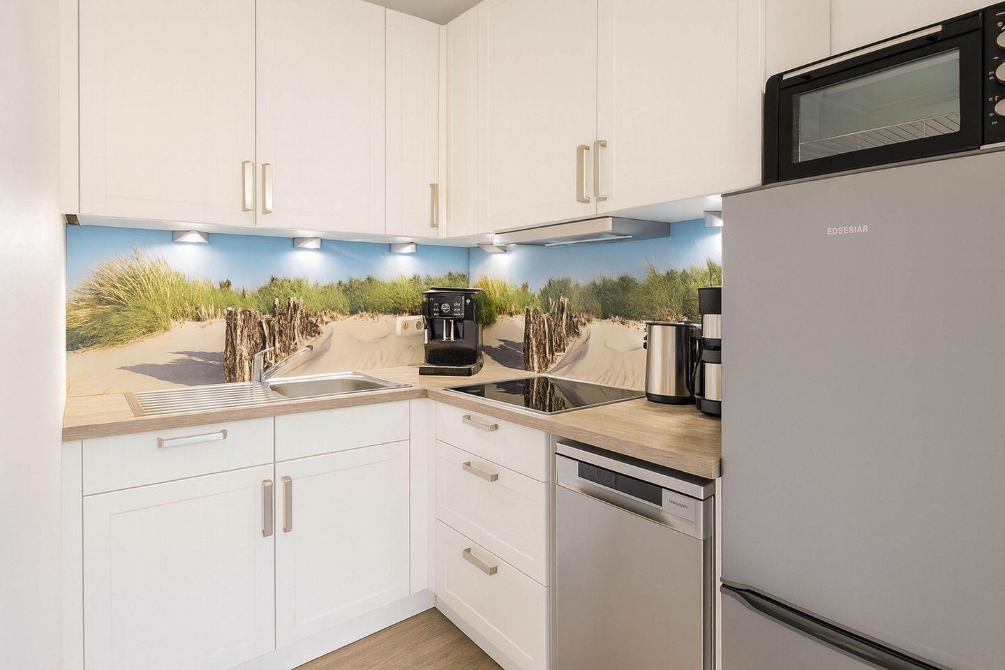 Die moderne Küchenzeile ist vollständig ausgestattet und lässt keine Wünsche offen. Sie verfügt über eine Geschirrspülmaschine, eine Mikrowelle, einen Herd, einen Kühlschrank mit Gefrierfach sowie einen Wasserkocher und einen Toaster. Ein hochwertiger Kaffeevollautomat der Marke De’Longhi sorgt für genussvolle Kaffeemomente zu jeder Tageszeit. Der helle Wohnbereich lädt zum Entspannen ein und bietet einen direkten Zugang zum Balkon, auf dem Sie morgens bei frischer Meeresluft entspannt frühstücken oder den Tag ausklingen lassen können.