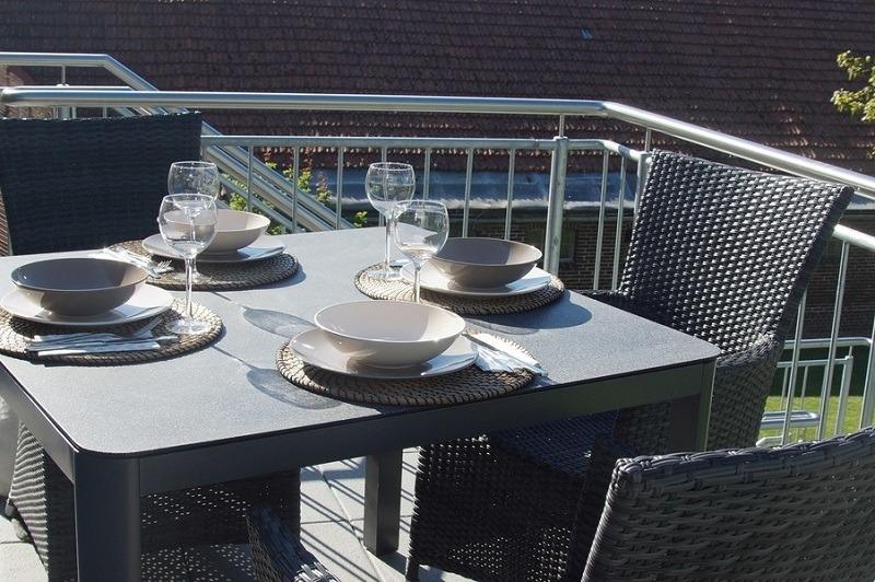 Moderne Ferienwohnung Abendrot in Schortens mit Balkon, Garten und ruhiger Lage auf dem Land, ideal für Familien und Paare.