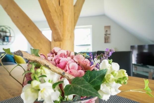 Besonderes Flair entsteht auch hier durch das offene Gebälk des alten Bauernhauses, welches optische Akzente setzt und zur gemütlichen Atmosphäre der Wohnung beiträgt. Bis zu 4 Personen können in dieser Wohnung den Urlaub genießen. Hierfür steht neben einem Schlafzimmer mit einem Doppelbett noch ein kleines Zimmer mit zwei Einzelbetten zur Verfügung. Ebenfalls gehört zu dieser Wohnung auch ein Balkon der Ihnen z. B. in den Abendstunden einen herrlichen Rückzugsort mit Blick auf die Weser bietet.