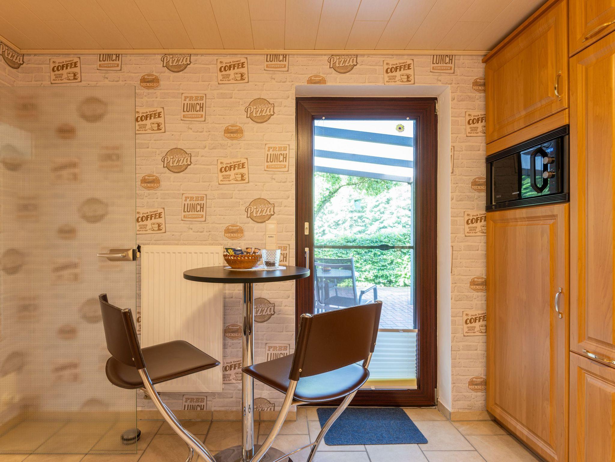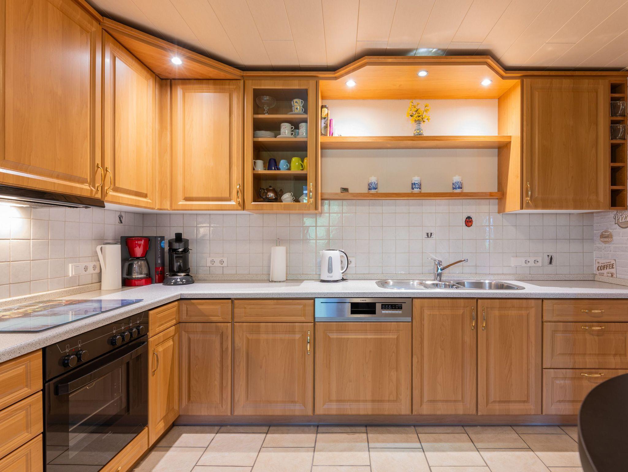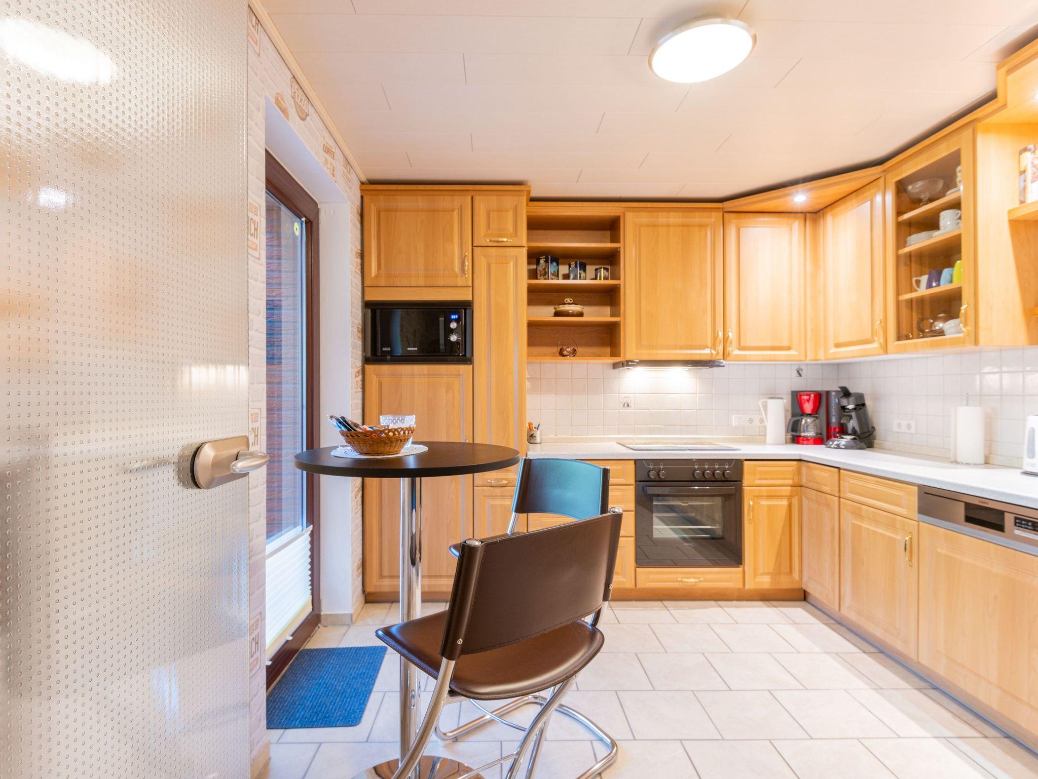 Die Küche ist ausgestattet mit E-Herd (mit Backofen), Spülmaschine, Mikrowelle, Kühlschrank mit Eisfach, Kaffeemaschine, Wasserkocher, Toaster, Eierkocher, Besteck und ausreichend Pfannen und Töpfe, sowie Geschirr. Für den schnellen Snack steht ein Bistrotisch mit zwei Hochstühlen und eine Senseo-Kaffeemaschine in der Küche bereit.