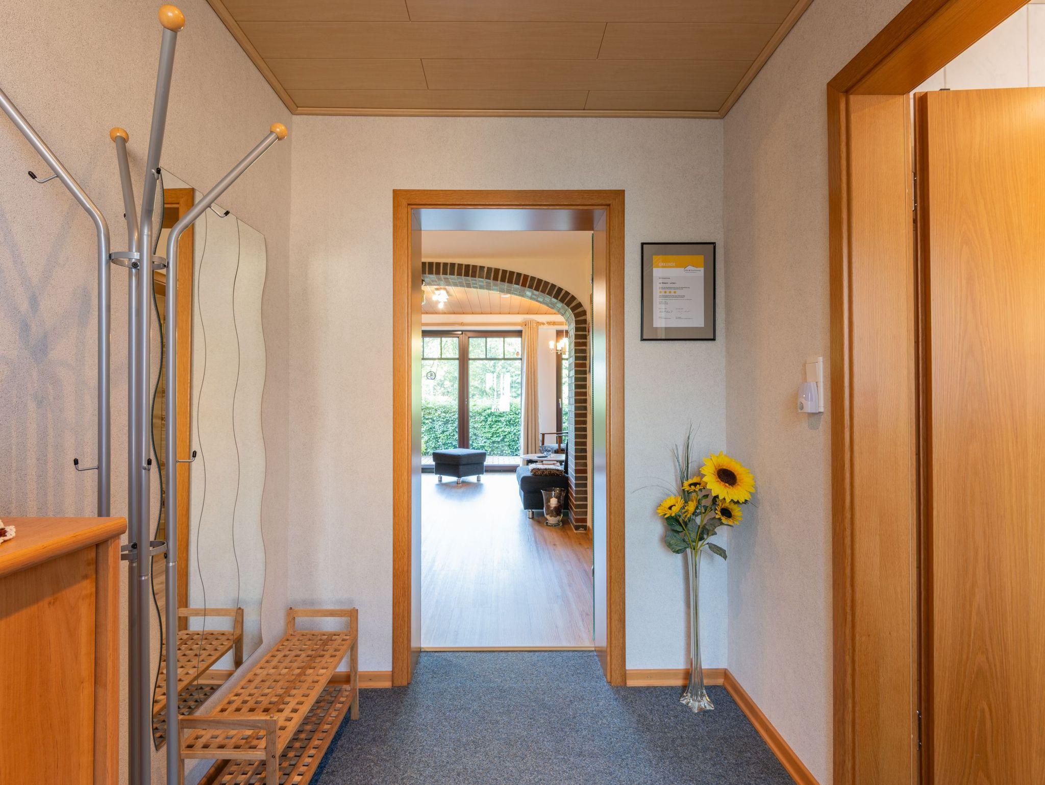 Im Flur gehören Garderobe, Ganzkörperspiegel, Regenschirme, Schuhanzieher und eine Anrichte mit diversen Prospekten zur Ausstattung.