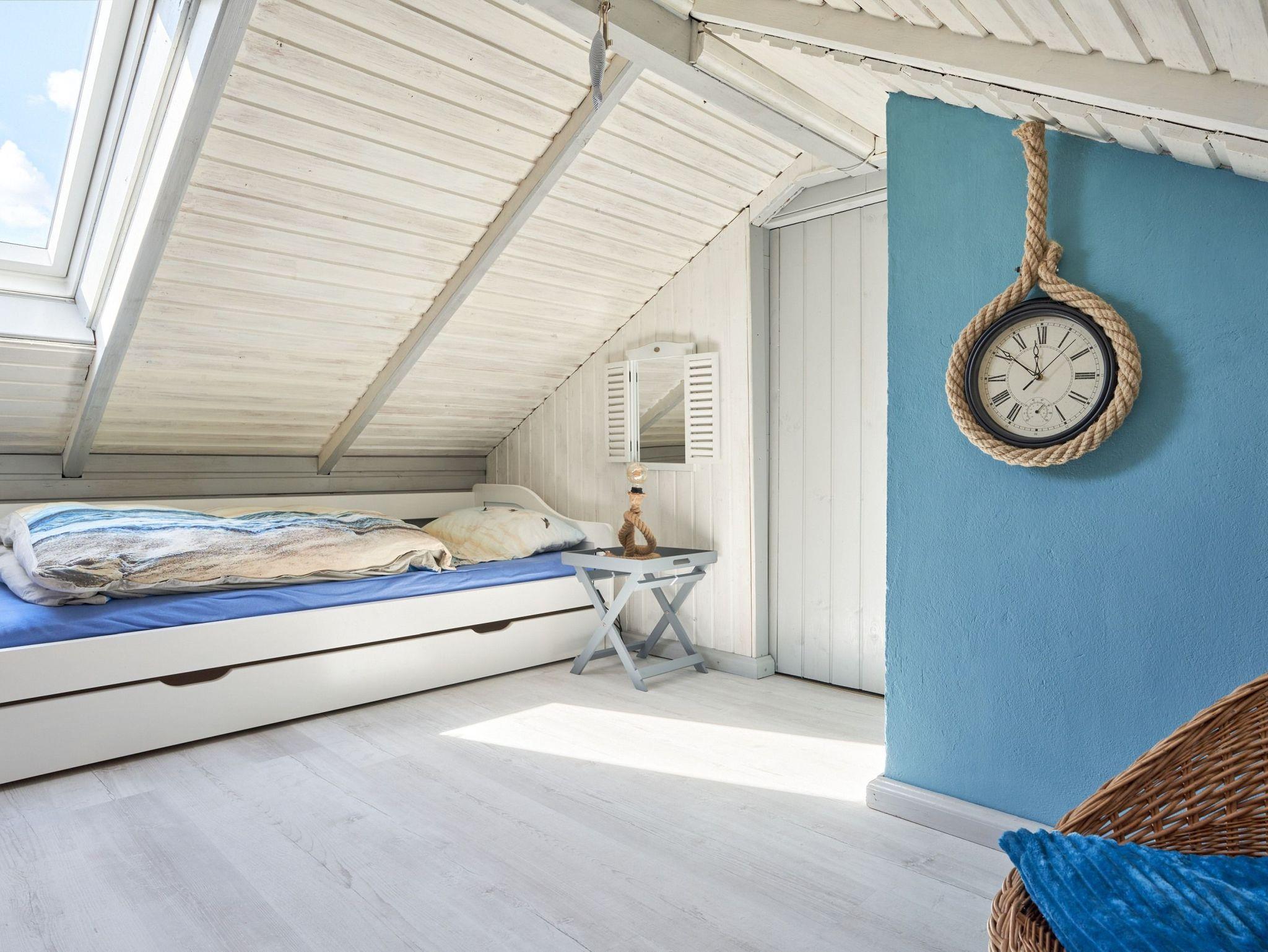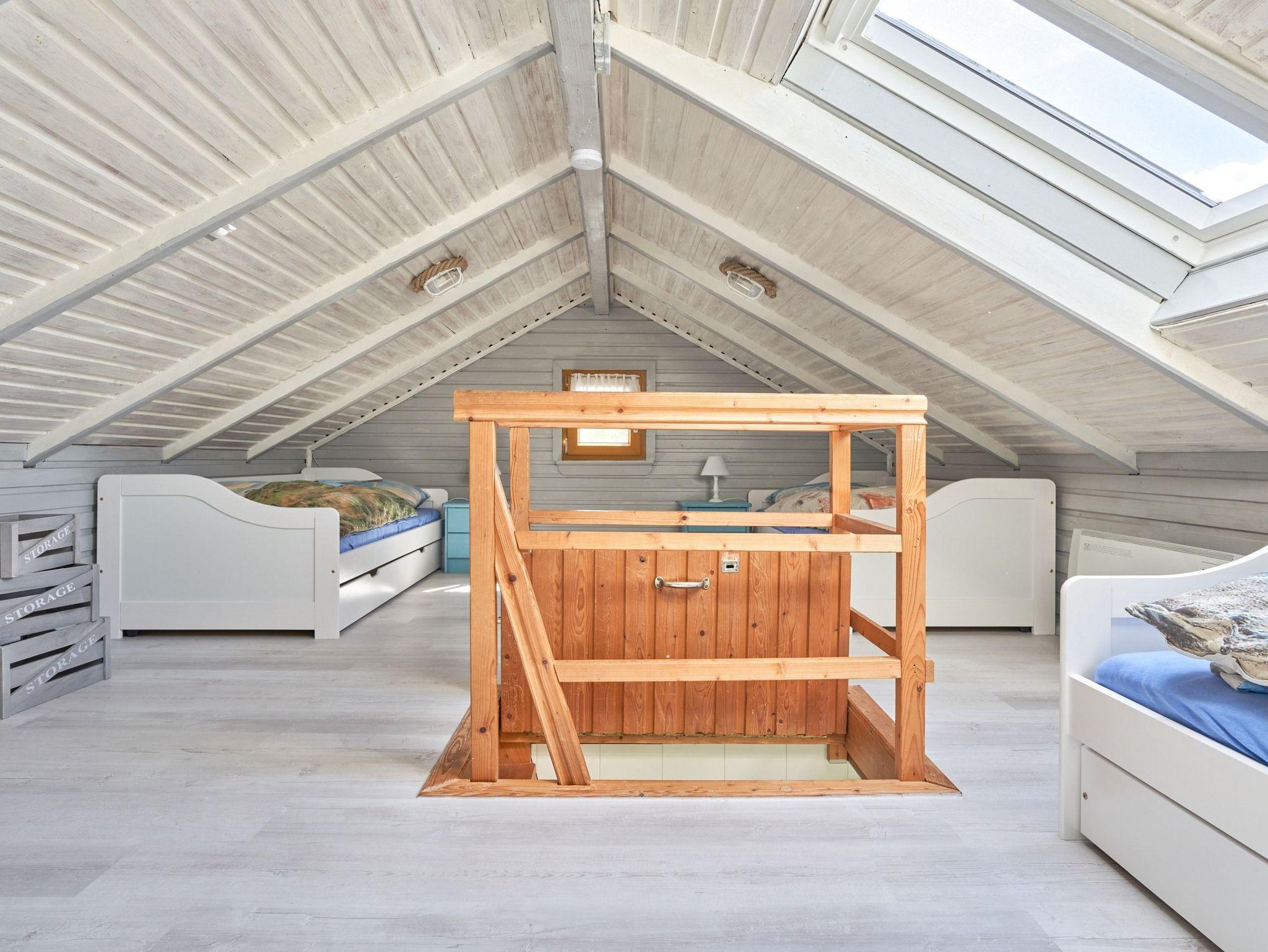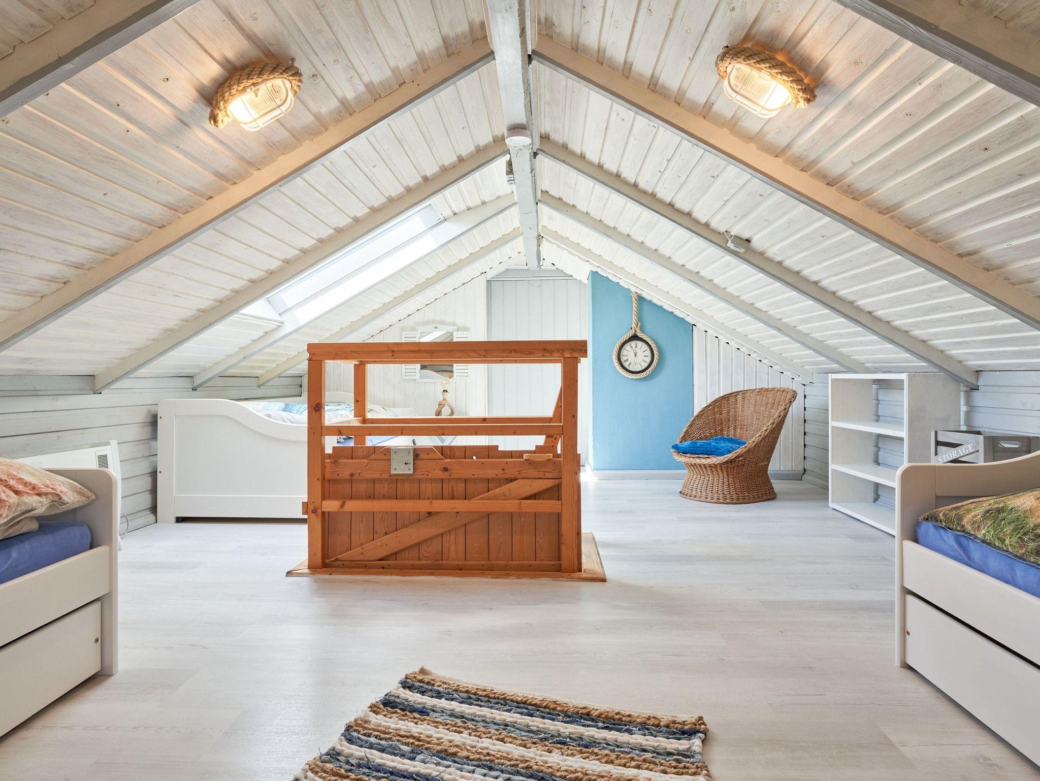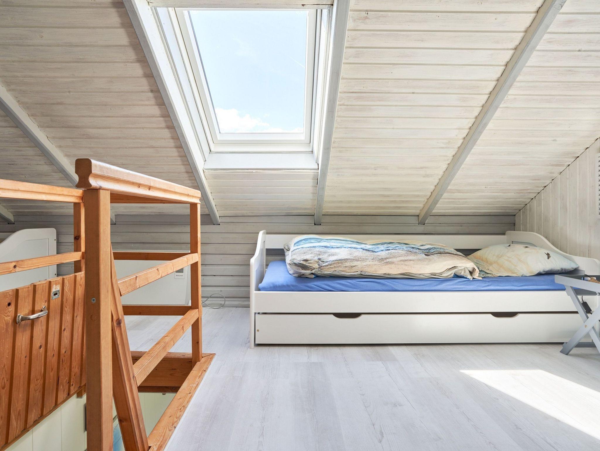 Im Dachgeschoss befindet sich das zweite Schlafzimmer mit drei Einzelbetten (3x 90x200) in einem „hyggeligen“ Zimmer; Zugang durch steile Treppe. Ein wahres Paradies für Kinder.