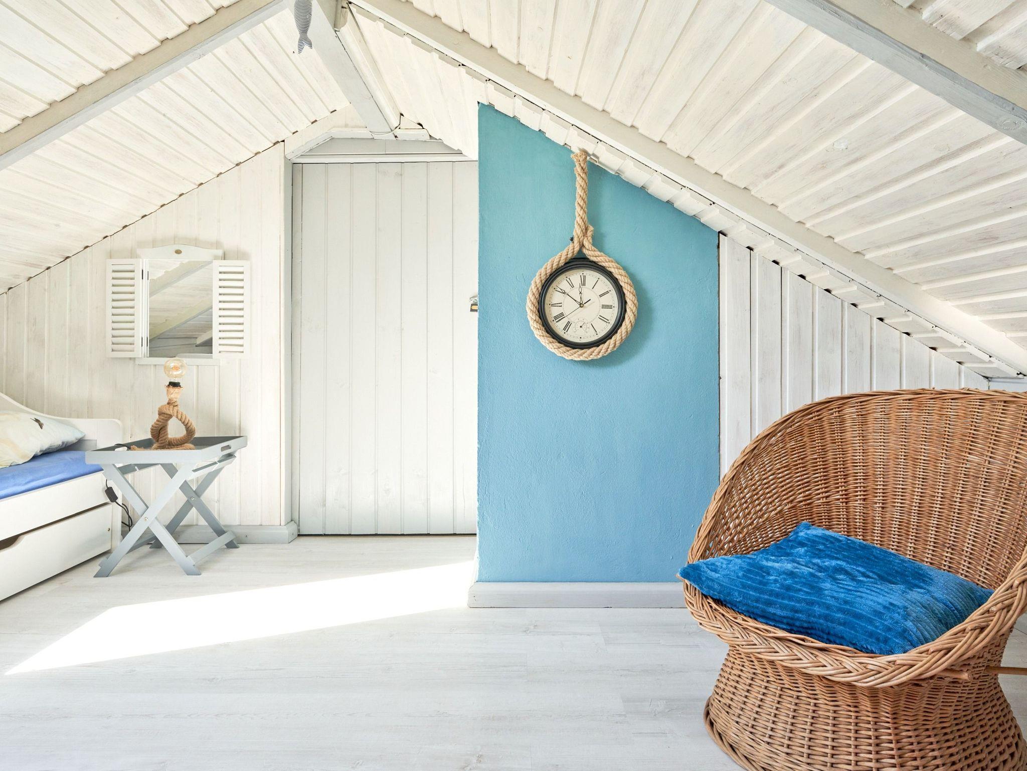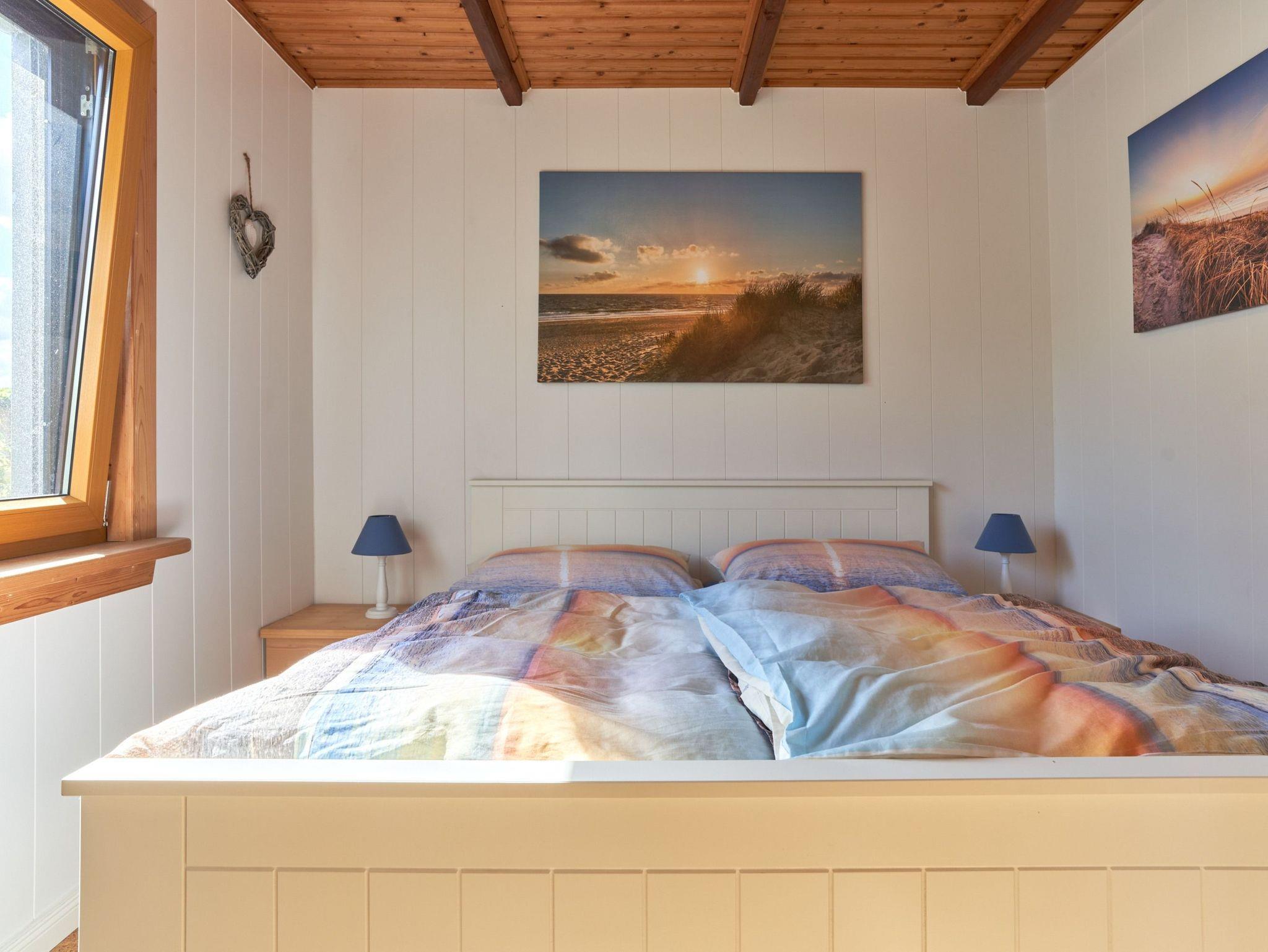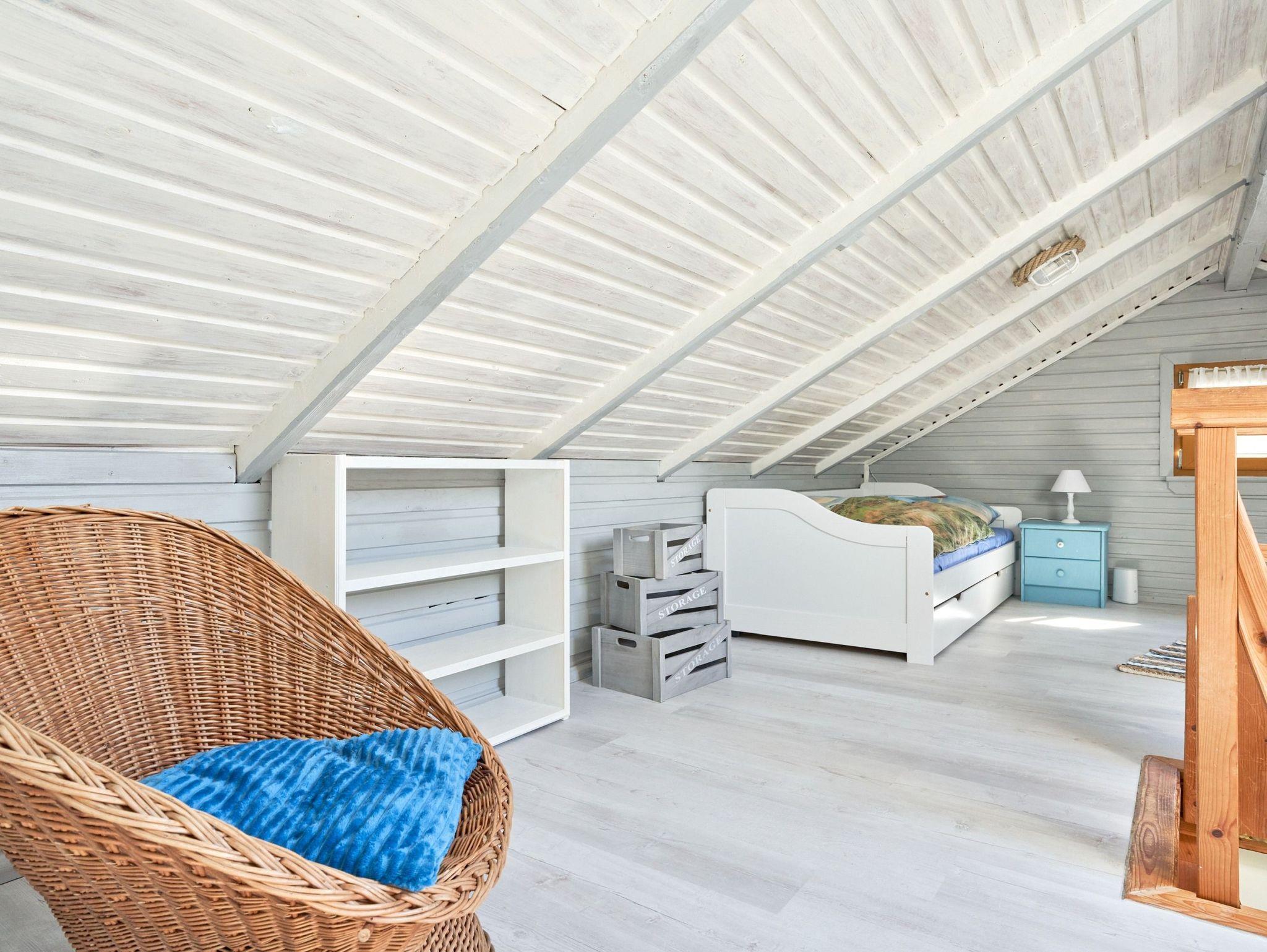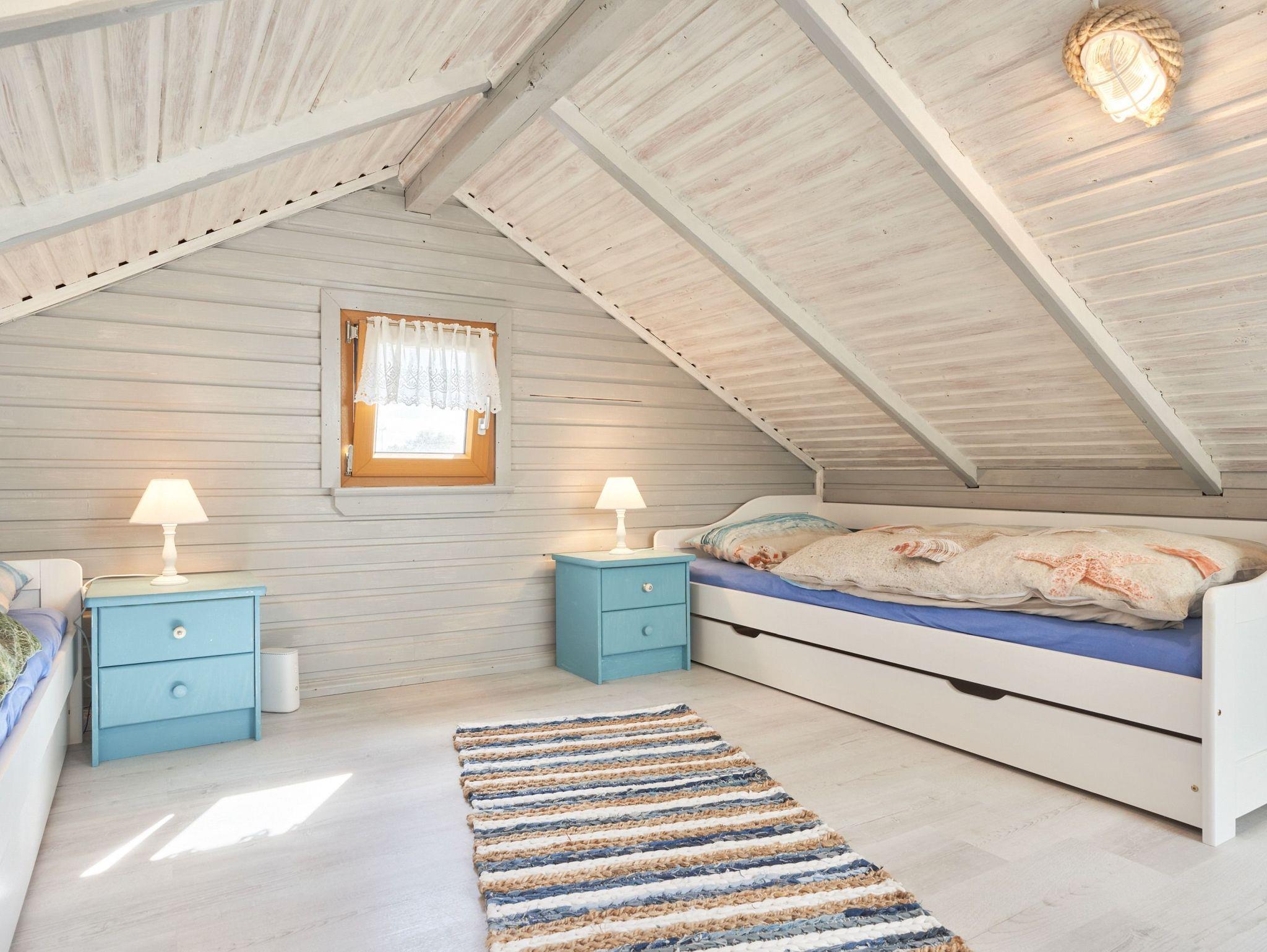 Im Dachgeschoss befindet sich das zweite Schlafzimmer mit drei Einzelbetten (3x 90x200) in einem „hyggeligen“ Zimmer; Zugang durch steile Treppe. Ein wahres Paradies für Kinder.