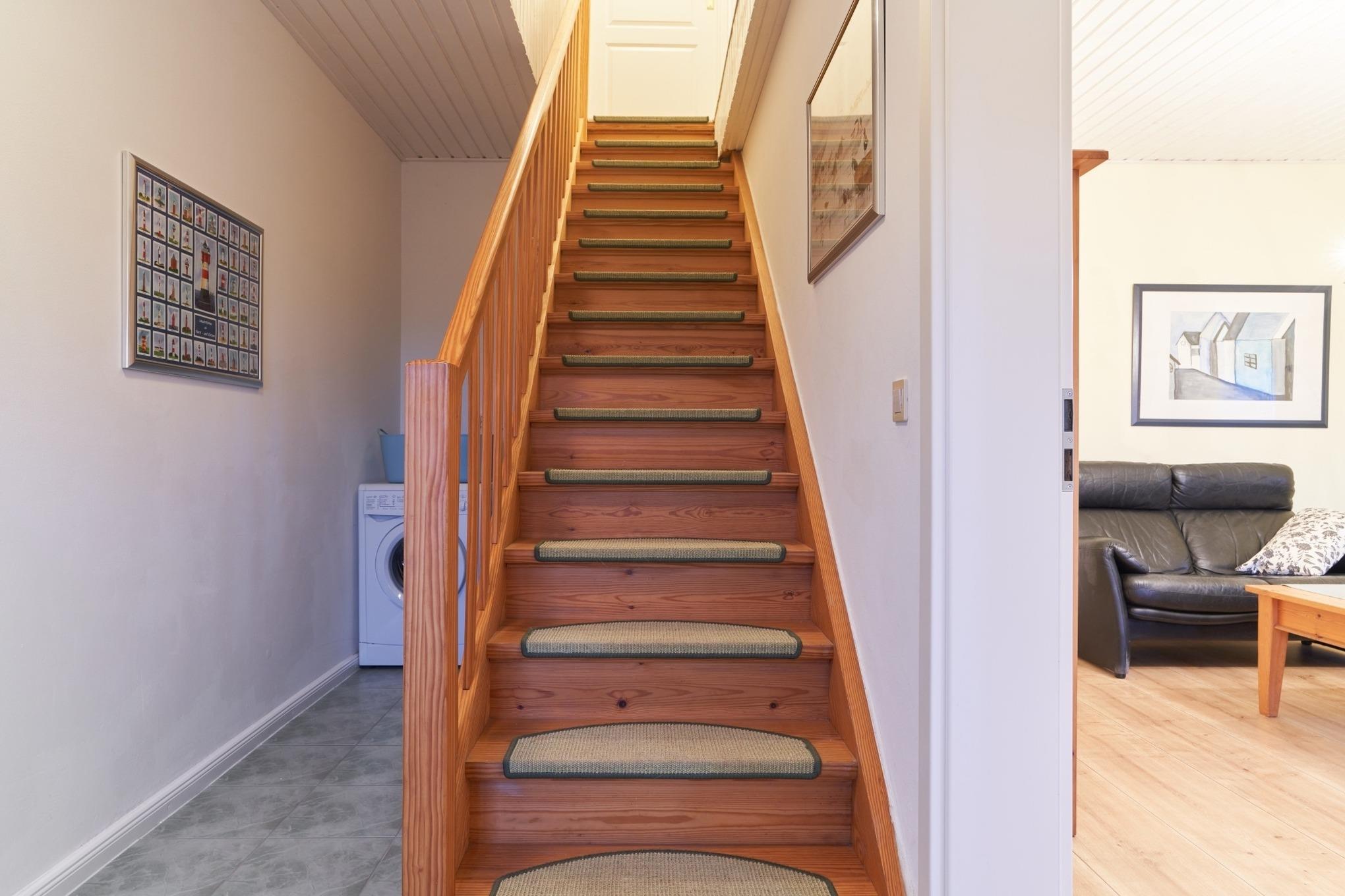 Im Erdgeschoss befindet sich außerdem ein modernes Duschbad mit WC sowie eine Waschmaschine – praktisch für längere Aufenthalte oder den Urlaub mit Hund.