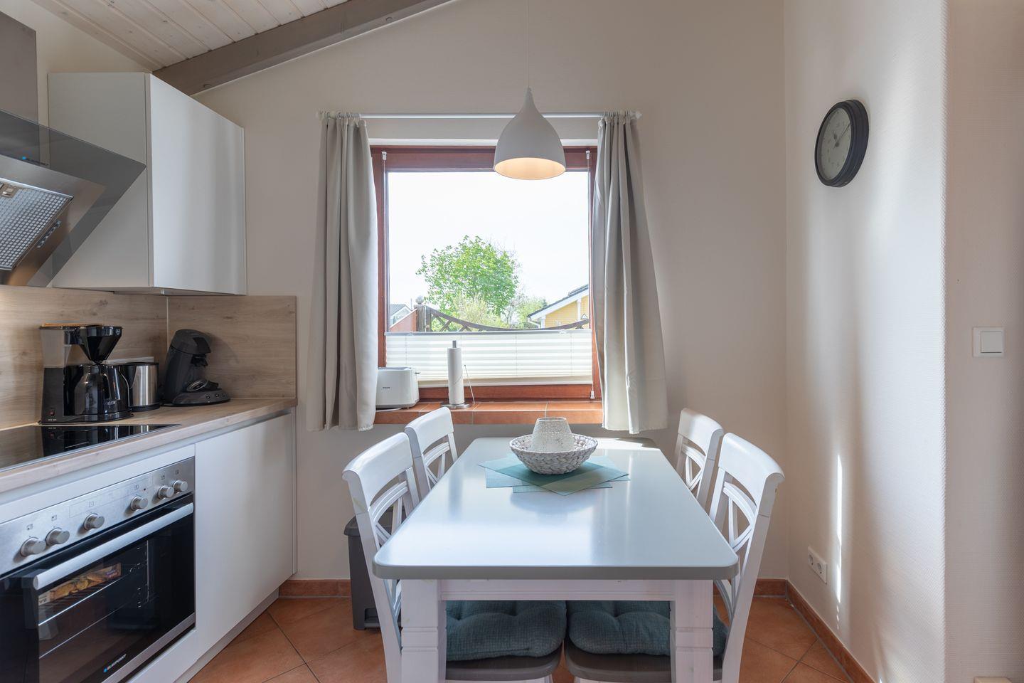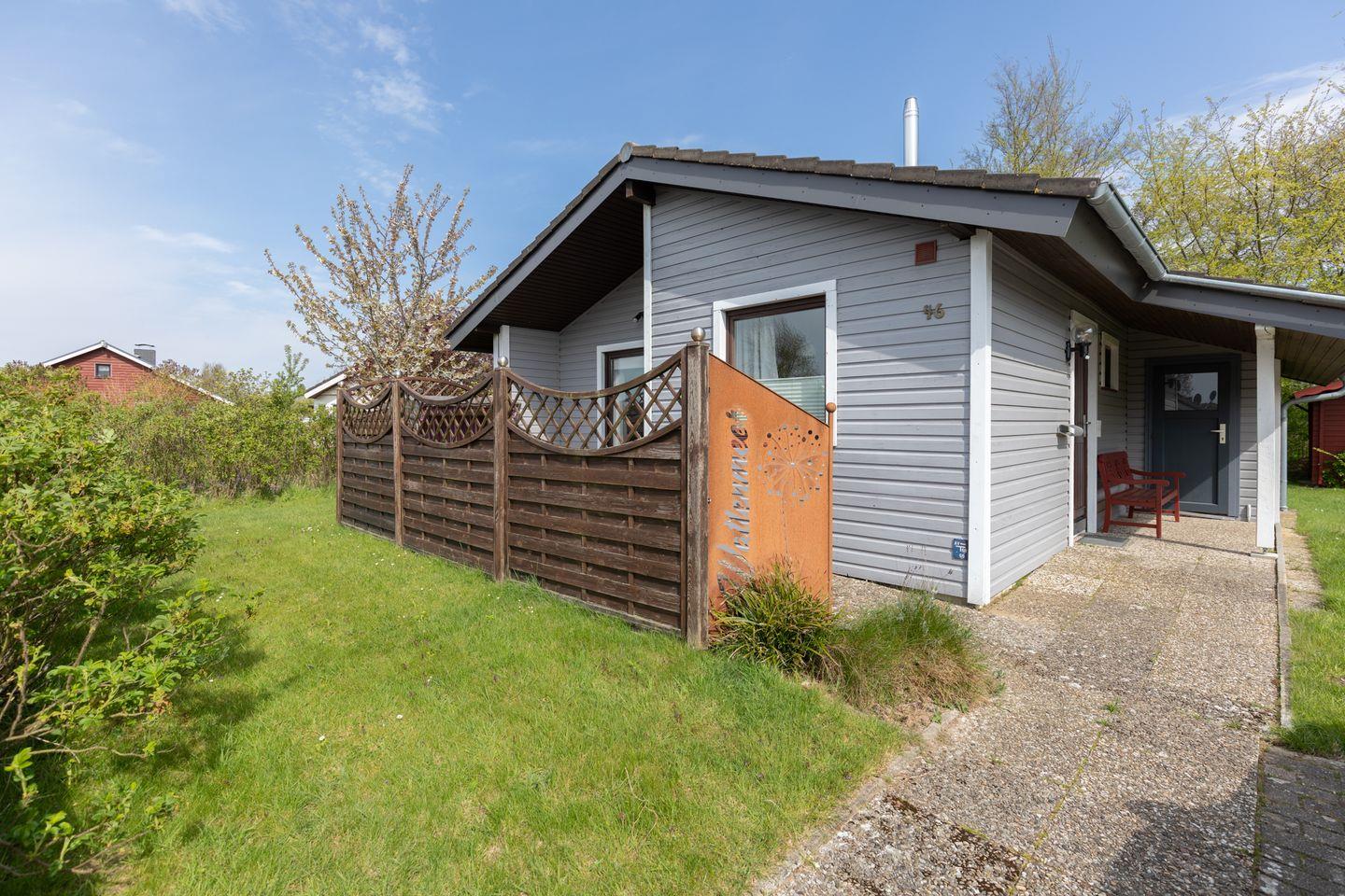 Unser Ferienhaus bietet auf 50 qm Platz für bis zu vier Personen. Es ist mit einem gemütlichen Wohnbereich mit Kaminofen, SAT-TV, mit einer offenen Küche und einer dazugehörigen Senseo Kafeemaschine und Essplatz und einem Duschbad eingerichtet. Es verfügt über zwei Schlafzimmer: ein Doppelbett (160 x 200) und einem Etagenbett (jeweils 90 x 200). Bei Ankunft sind Ihre Betten bezogen.