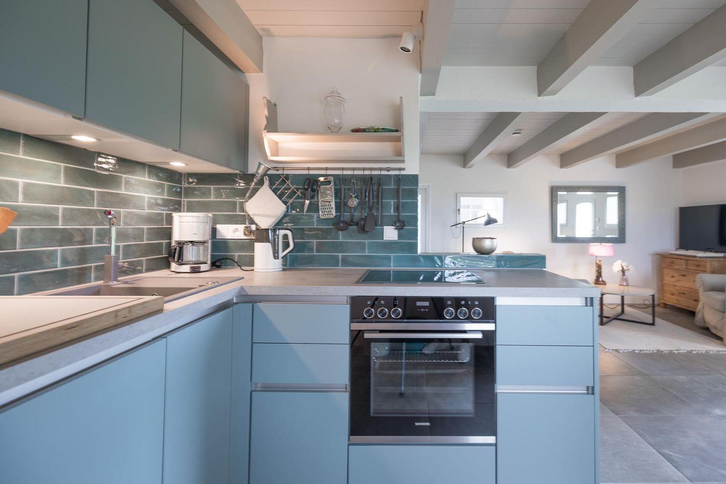 Unser Ferienhaus bietet auf gut 70 qm Platz für bis zu vier Personen. Im Erdgeschoss erwartet Sie ein behaglich eingerichteter Wohnbereich, wo Sie sich in der gemütlichen Sofaecke vor dem großen Flachbild-TV und dem Kaminofen entspannen können. Die offene und bestens ausgestattete Küche verfügt über einen Kühlschrank mit Gefrierfach, Geschirrspüler, Herd, Backofen, Mikrowelle, Kaffeemaschine, Wasserkocher und Toaster. Der helle Essbereich lädt zum gemeinsamen Genießen ein. Eine Fußbodenheizung sorgt im gesamten Erdgeschoss für angenehme Wärme.