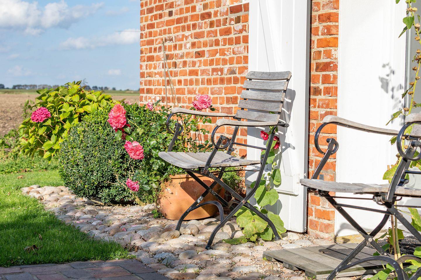 Auf der Terrasse mit Gartenmöbeln und einem Elektrogrill können Sie entspannt den Tag ausklingen lassen. Ihre mitgebrachten Fahrräder finden Platz in einem Anbau.
