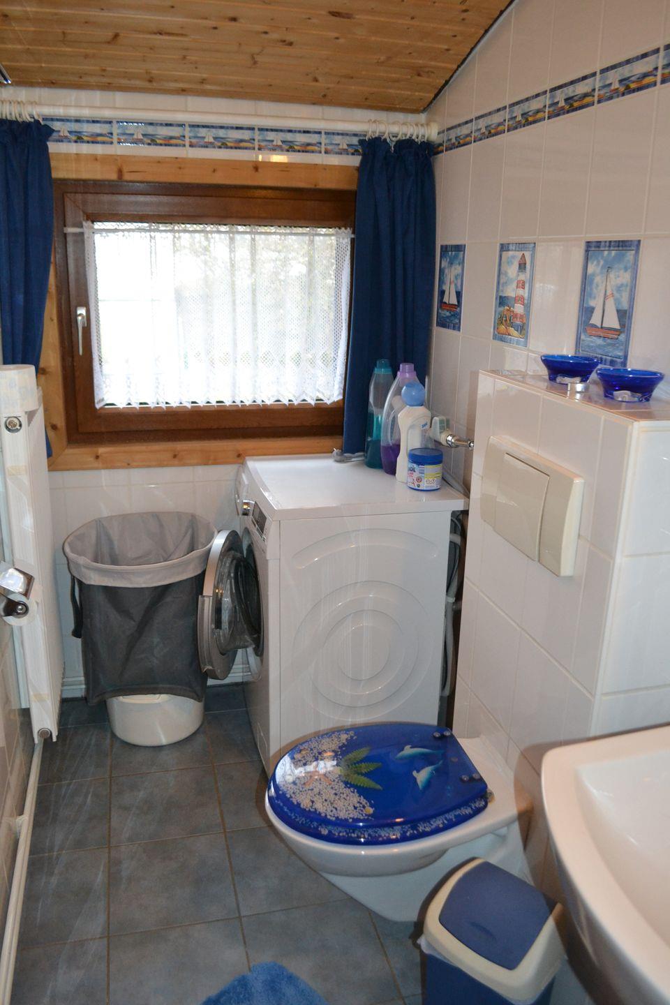 Das Bad hat eine Dusche mit niedriger Duschtasse und geregelter Thermostatbatterie, sowie eine Waschmaschine für die Wäsche zwischendurch.