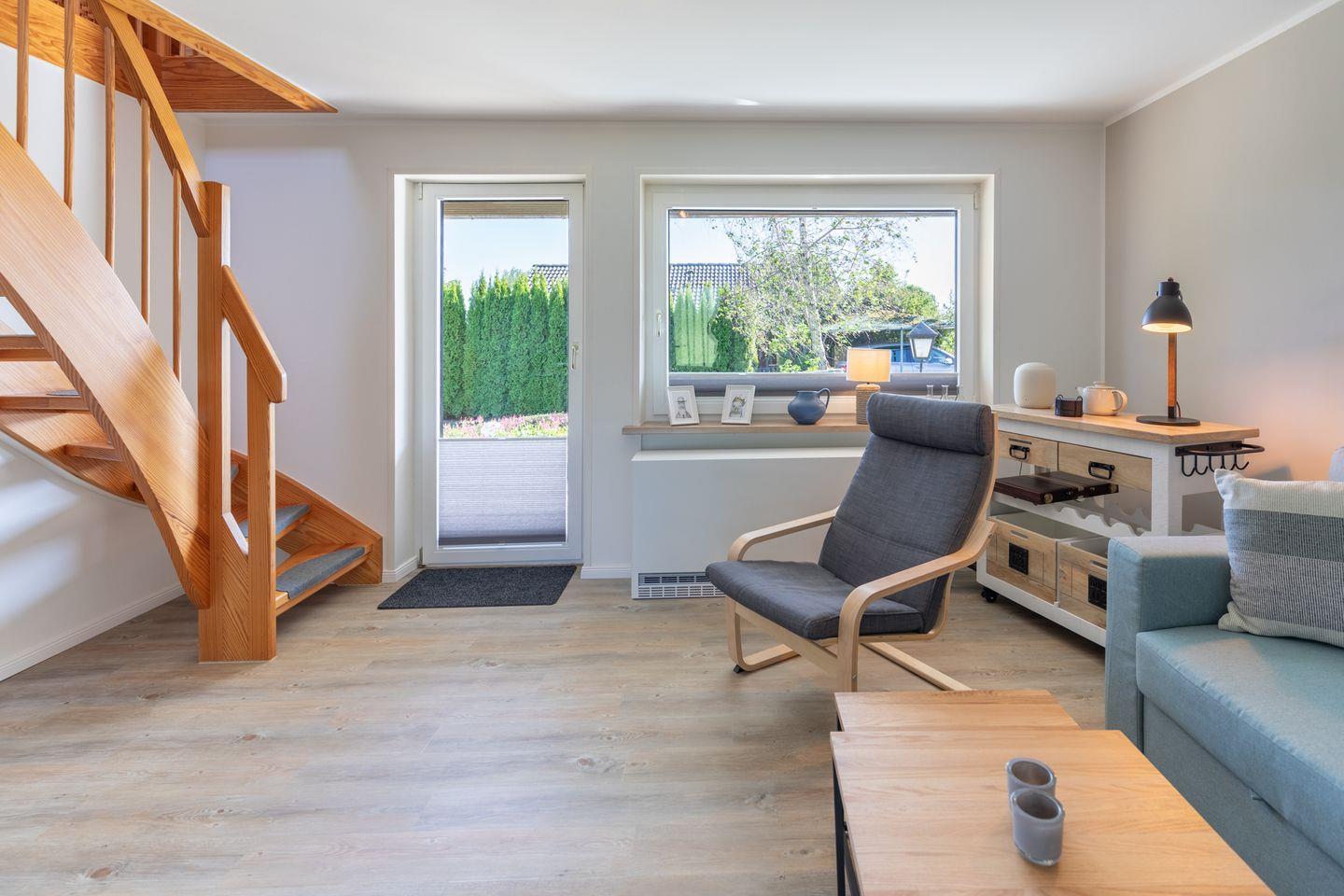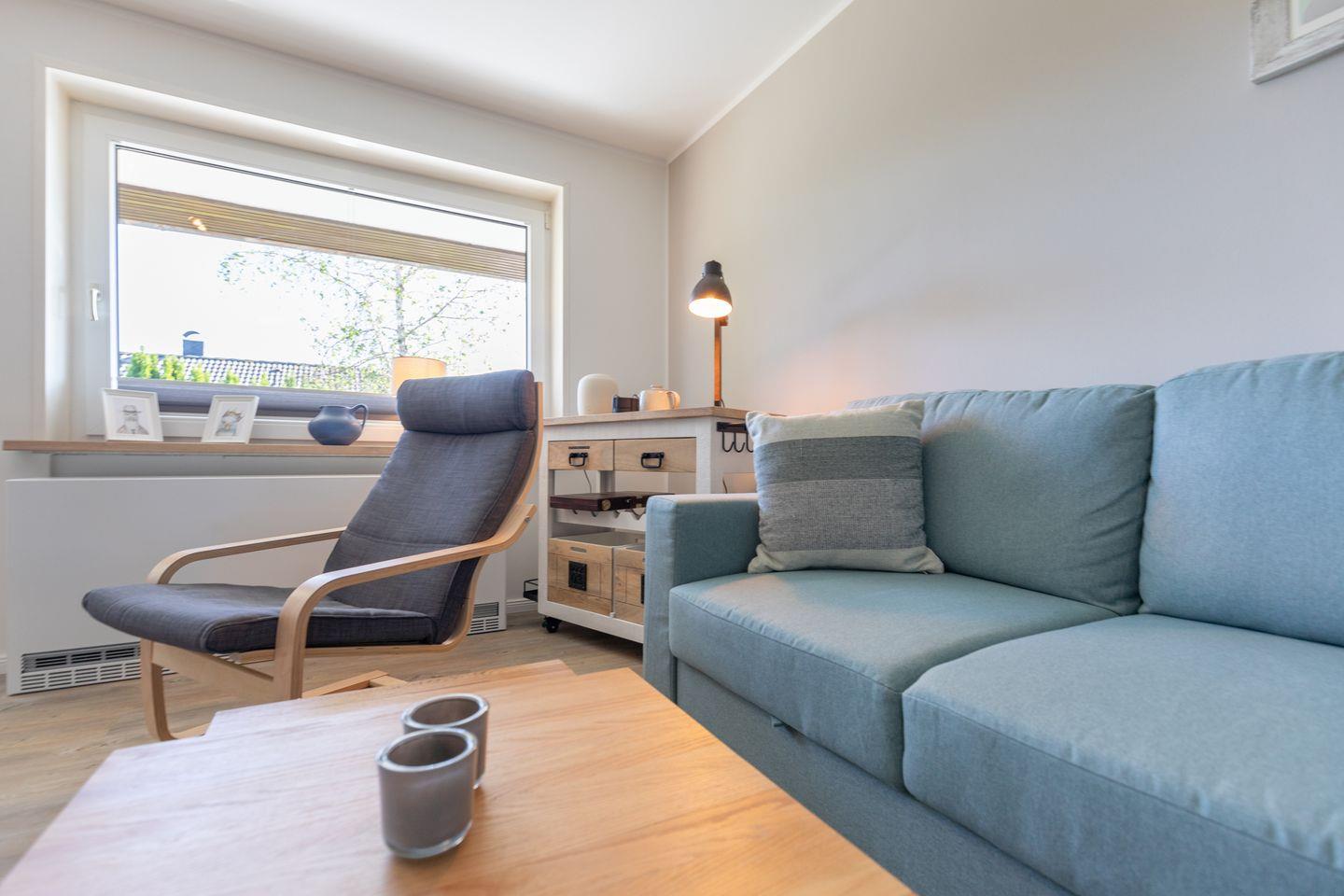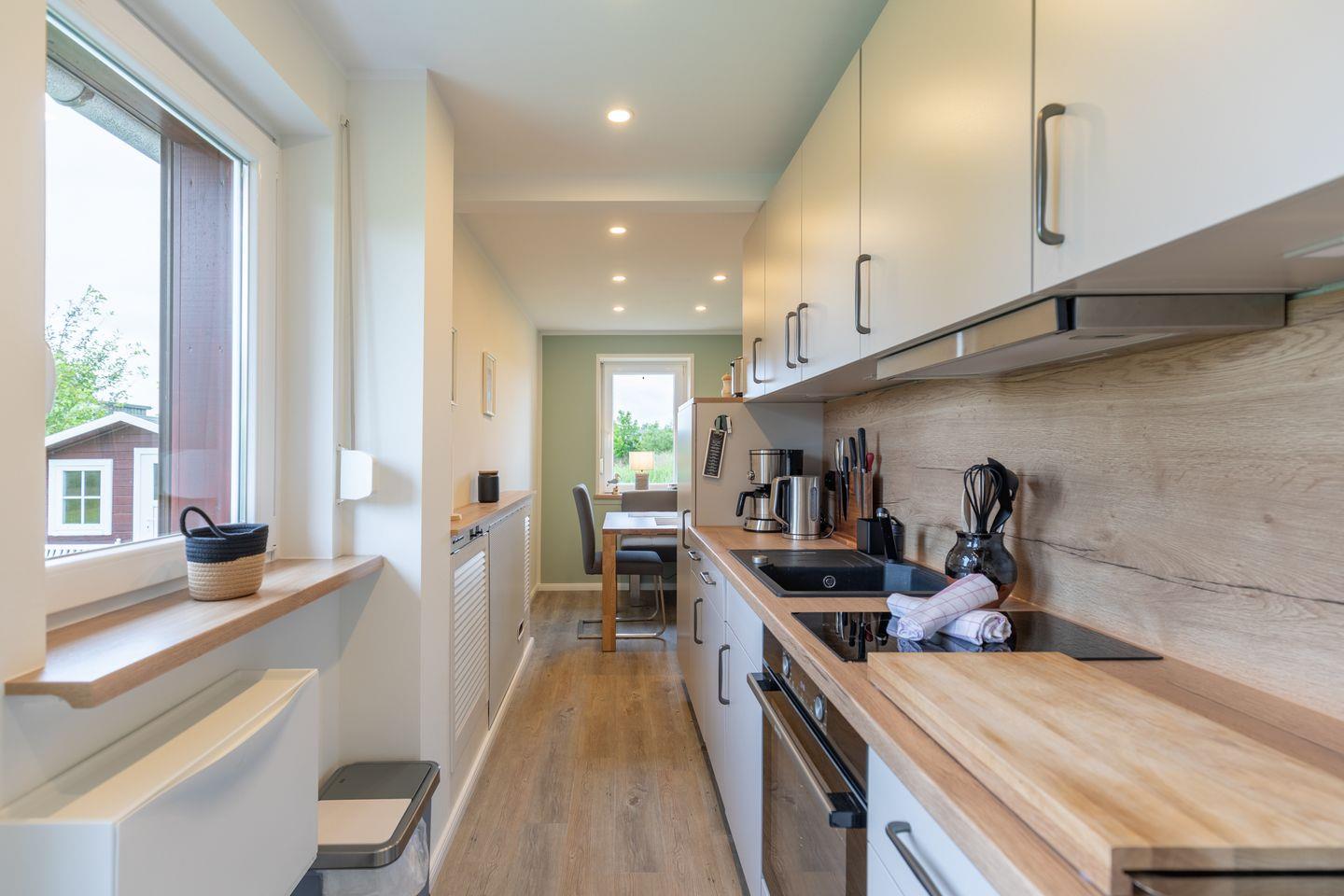 „De lütte Mööv“ bietet im Erdgeschoss eine voll ausgestattete Küche mit gemütlicher Sitzecke, in der von Kaffeemaschine und French-Press, über Toaster und Tupperware bis Auflaufformen alles an Bord ist. Das gemütliche Wohnzimmer ist mit waipu.tv und einer Sony Playstation 4 inklusive Blu-ray-Player ausgestattet. Dank Glasfaseranschluss ist man digital ganz fix unterwegs. Das Schlafzimmer bietet ein Doppelbett (160 x 200) und viel Stauraum im Wandschrank. Das kleine Bad verfügt über eine Dusche und WC.