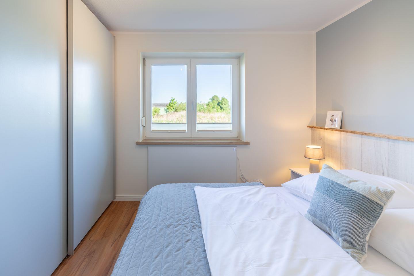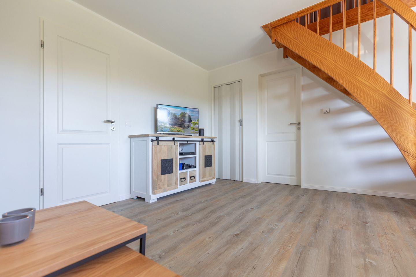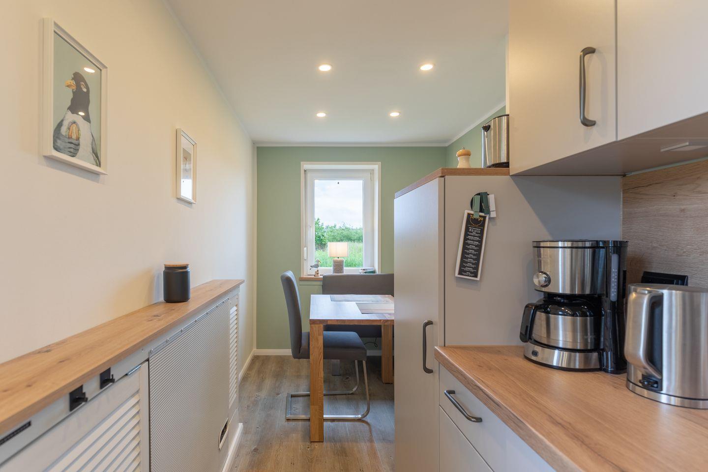 „De lütte Mööv“ bietet im Erdgeschoss eine voll ausgestattete Küche mit gemütlicher Sitzecke, in der von Kaffeemaschine und French-Press, über Toaster und Tupperware bis Auflaufformen alles an Bord ist. Das gemütliche Wohnzimmer ist mit waipu.tv und einer Sony Playstation 4 inklusive Blu-ray-Player ausgestattet. Dank Glasfaseranschluss ist man digital ganz fix unterwegs. Das Schlafzimmer bietet ein Doppelbett (160 x 200) und viel Stauraum im Wandschrank. Das kleine Bad verfügt über eine Dusche und WC.