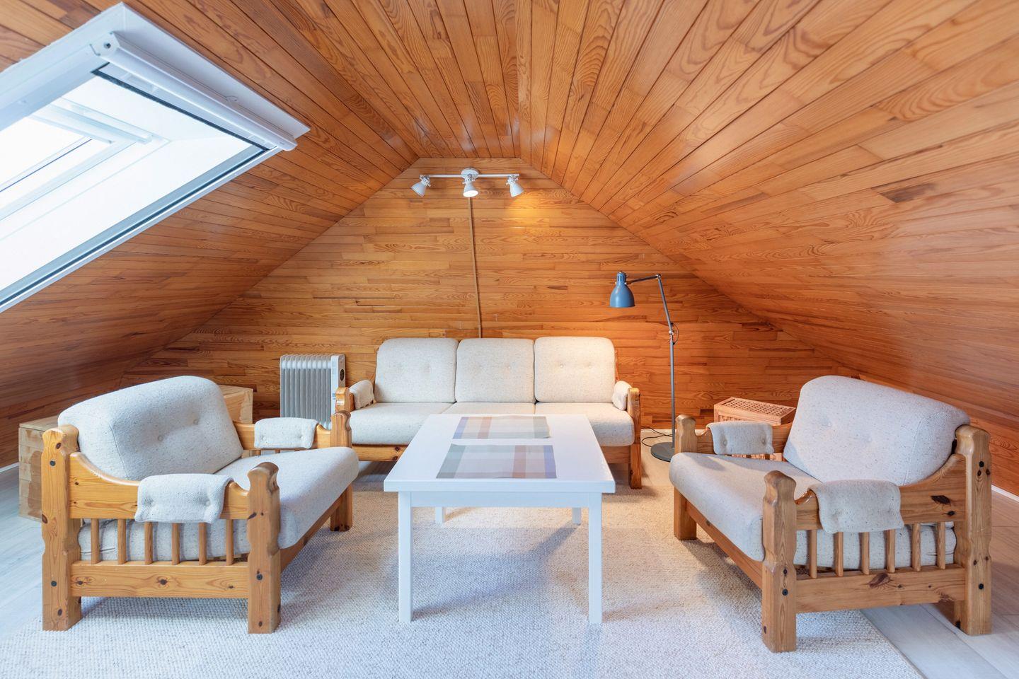 Über eine Holztreppe gelangt man in die offene, zweite Etage. Hier finden sich zwei Einzelschlafplätze (90 × 200) mit Stauräumen, sowie eine kuschelige Sitz- und Spielecke. Das Regal ist hier gefüllt mit Spielen, Büchern und Puzzles. Unter dem Spitzdach mit großen Dachfenstern befindlich, gibt es zwar nur eine Stehhöhe von maximal 1,93 Metern, aber dafür einen hohen Gemütlichkeitsfaktor.