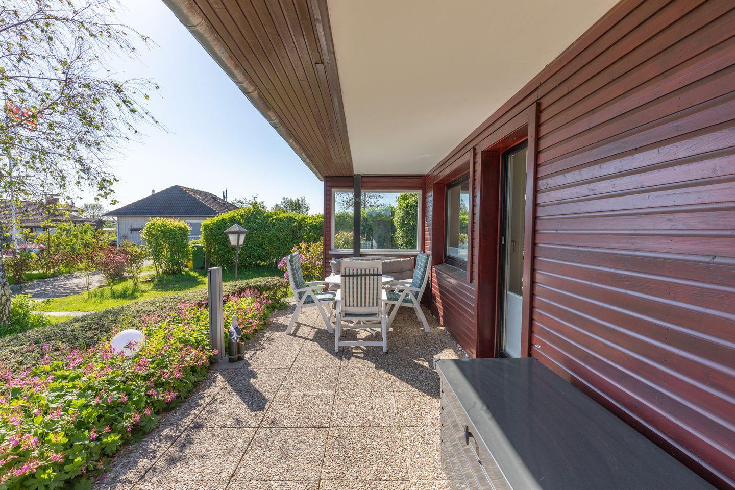 Eine große überdachte Terrasse mit Gartenmöbeln und Grill, viel Rasen und schöne Plätze laden zum Verweilen ein. Weil das Grundstück nicht umzäunt ist, gibt es auf der Terrasse die Möglichkeit, einen kleinen Teilbereich für den vierbeinigen Gast mit einer Seitenmarkise abzusichern.