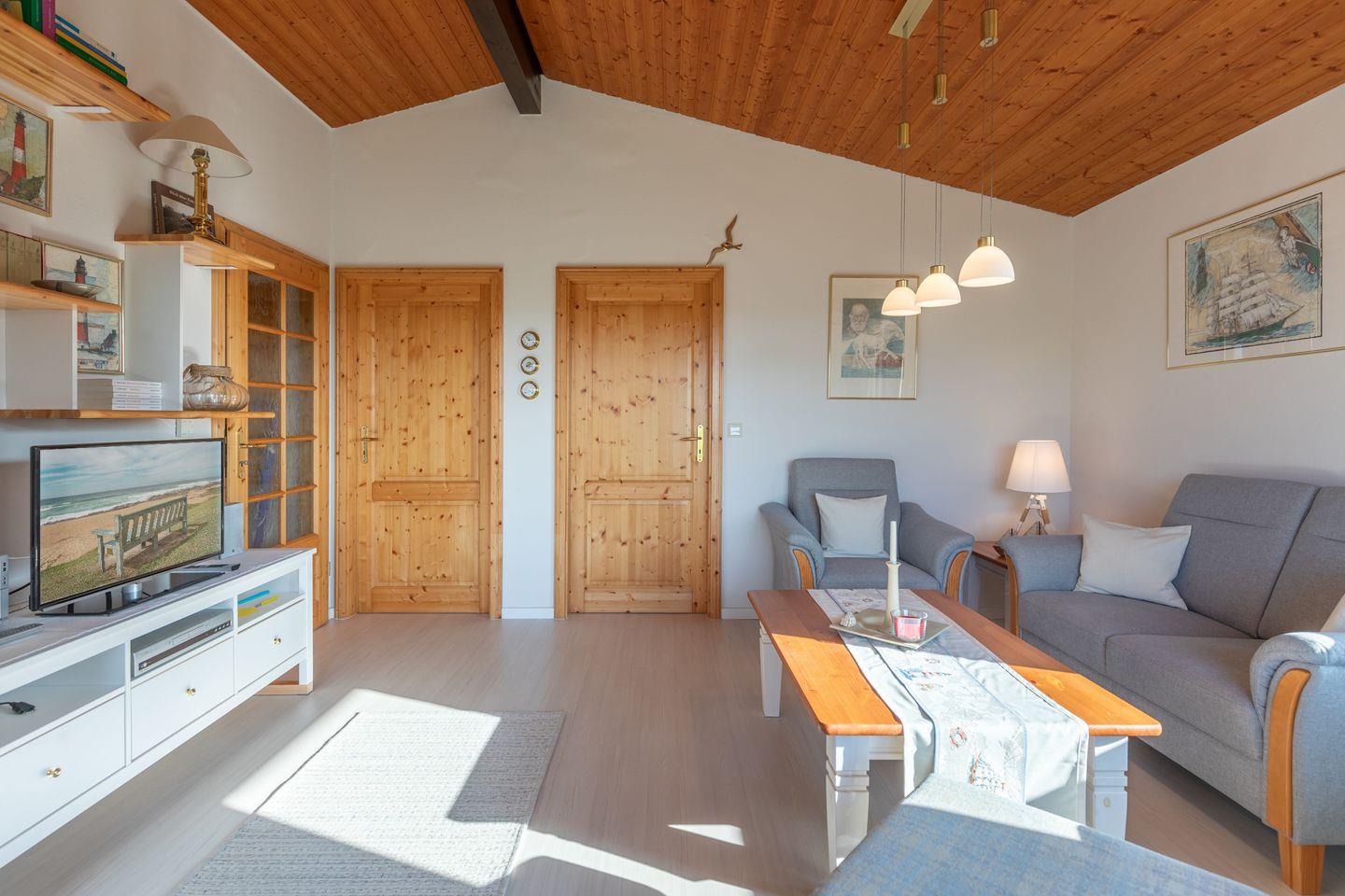 Mit 60 m² bietet die Unterkunft eine liebevolle Einrichtung und einen lichtdurchfluteten Wohnbereich mit Parkettboden, einer gemütlichen Sofaecke, TV, HiFi-Anlage und DVD-Player. Die separate Küche ist voll ausgestattet, darunter ein Esstisch, Cerankochfeld, Backofen, Wasserkocher, Mikrowelle und Kühlschrank. Eine Espressomaschine sorgt für Kaffee-Genuss, zudem gibt es eine Kaffeefiltermaschine (Filtergröße: 4). Zusätzlich gibt es eine Brotschneidemaschine.