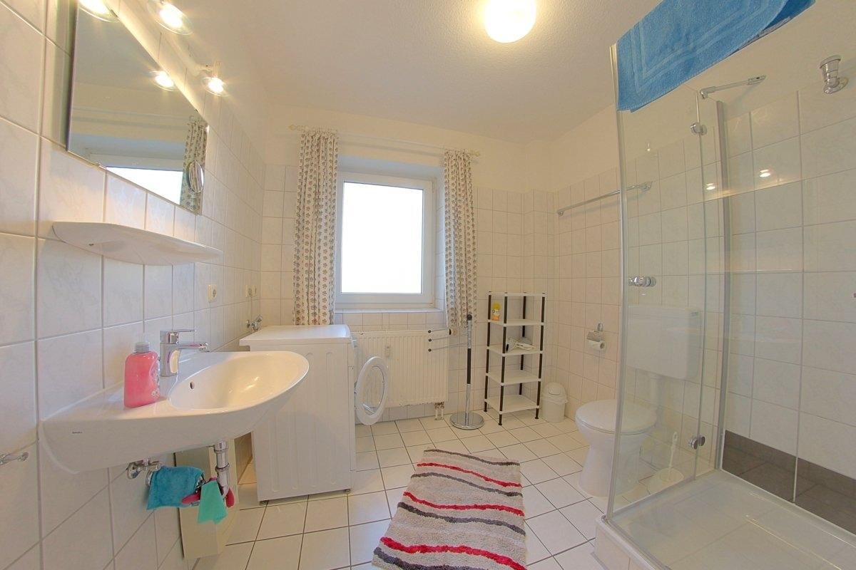 Das geräumige Duschbad mit großer Dusche, Fenster und Waschmaschine bietet ausreichend Platz.