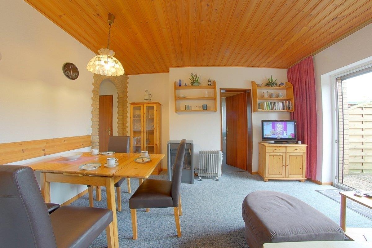 Das Haus verfügt über einen Wohnbereich mit Flachbild-TV, Sitzecke, Essplatz und eine kleine separate Küche mit E-Herd mit Backofen, Kühlschrank mit Gefrierfach, Kaffemaschine, Toaster und komplettem Geschirr.