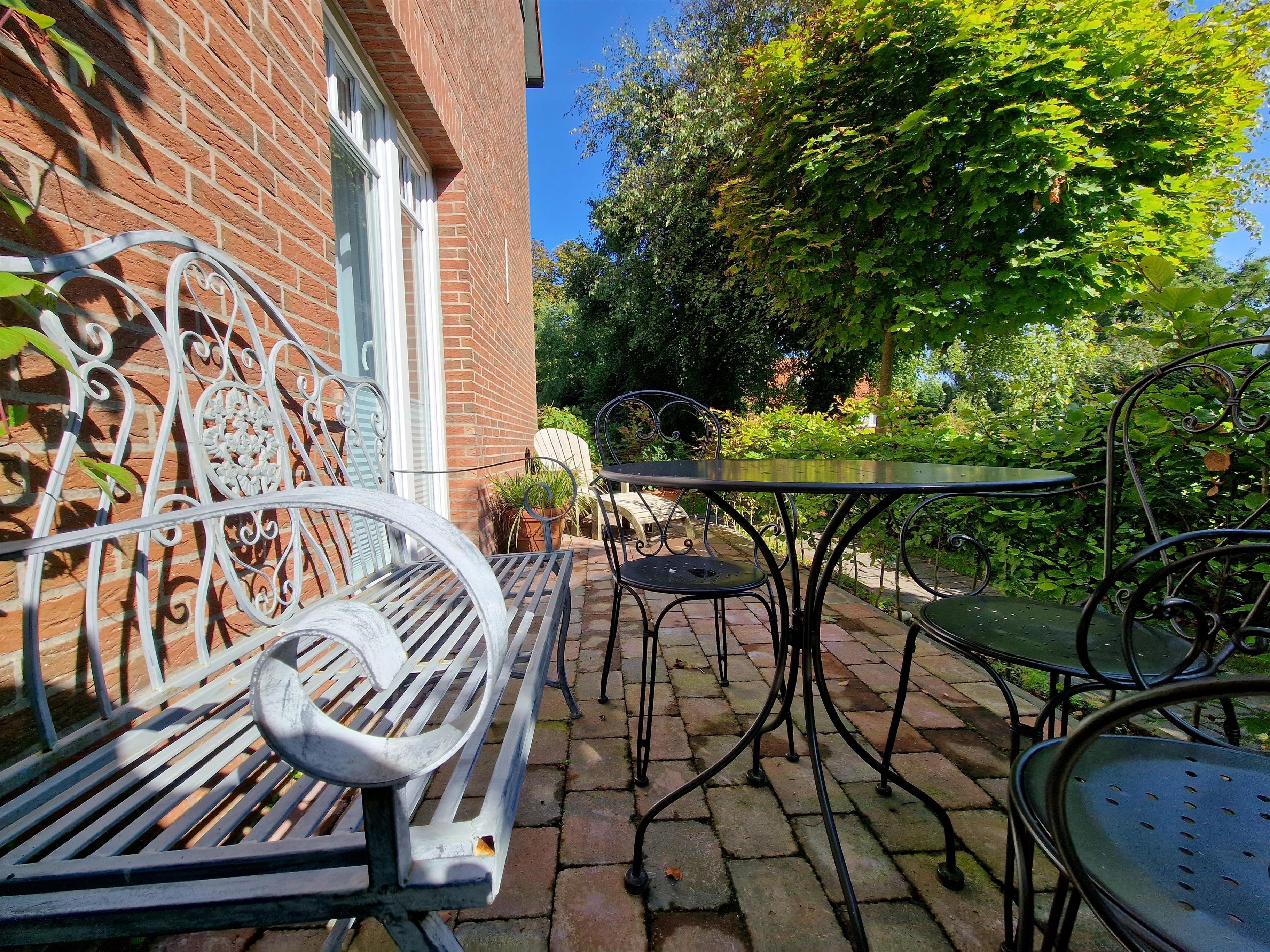 Charmante Ferienwohnung am ruhigen Kurpark in Spiekeroog mit modernem Strandhaus-Stil und sonnigem Garten für entspannte Inseltage.