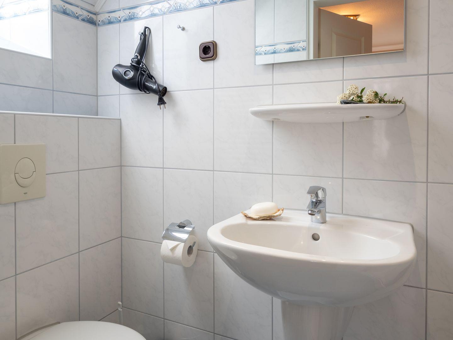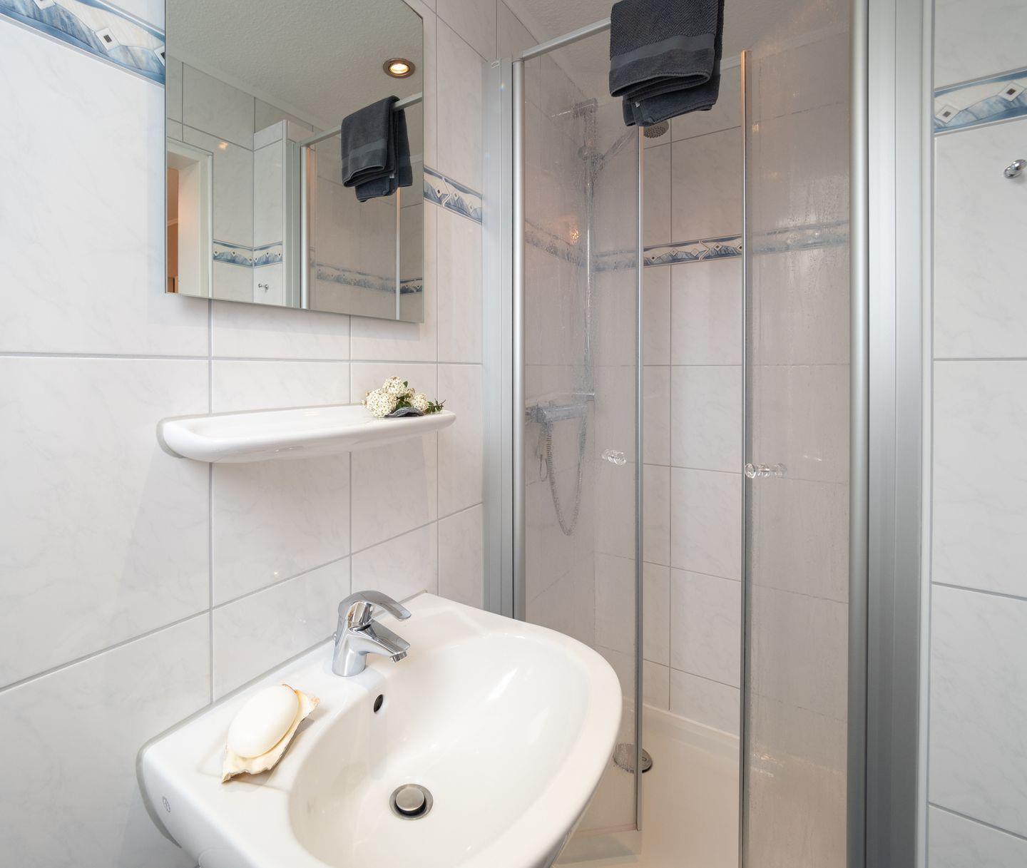 Das Badezimmer ist modern ausgestattet und verfügt über eine Dusche, WC und Waschbecken.