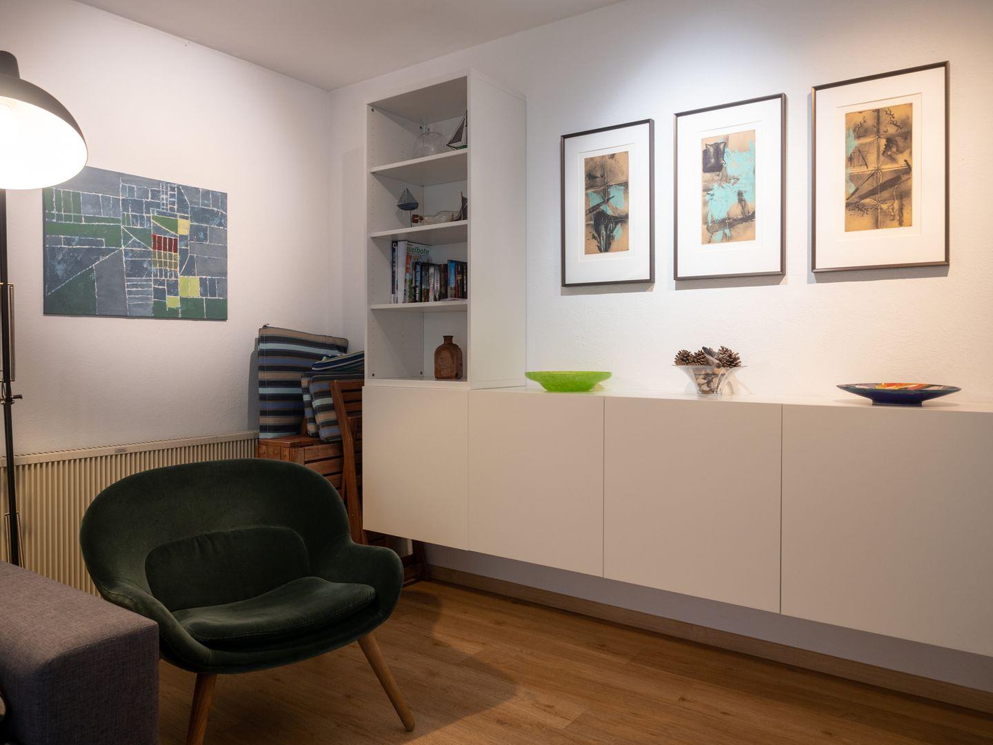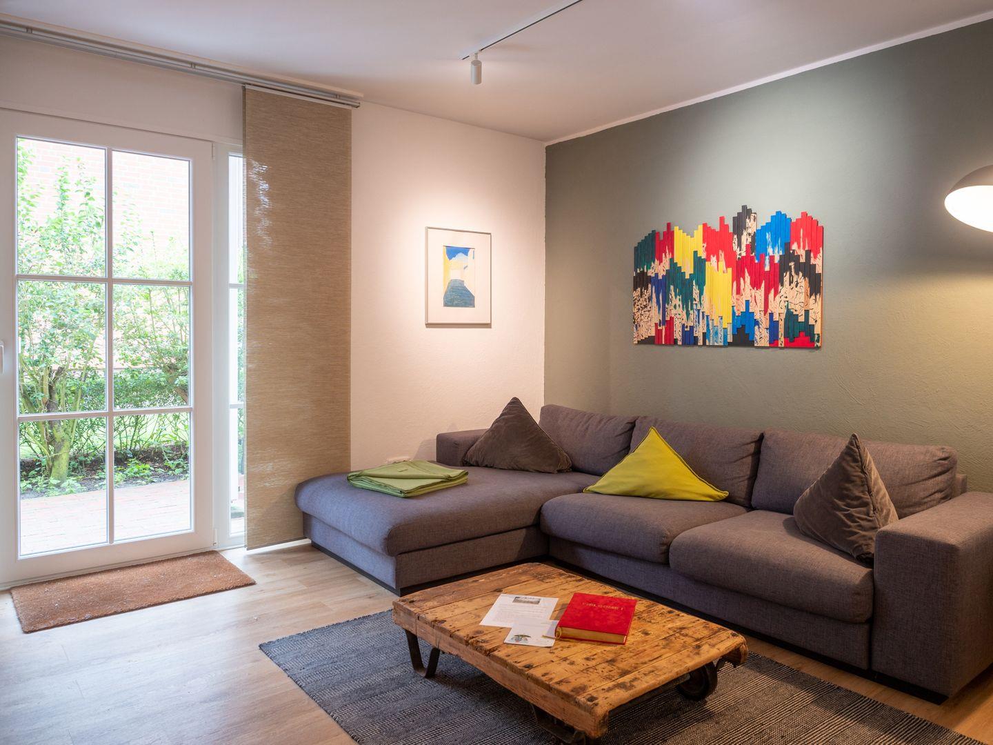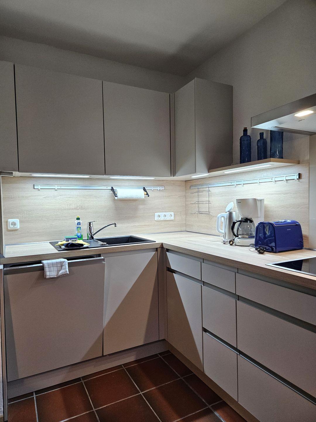 Die gemütliche Erdgeschosswohnung wurde neu renoviert und das zeitgemäße Mobiliar lädt zum Wohlfühlen ein. Das Wohn-/Esszimmer mit einem Esstisch und einem gemütlichen Sofa ist das Zentrum der Wohnung. Ein Flachbildschirm und liebevoll ausgewählte Kunstwerke und Möbelstücke runden das Ambiente ab. Die offene Küche bietet eine Ausstattung mit 4-Platten-Herd, Geschirrspülmaschine, Kühlschrank, Toaster, Wasserkocher und Kaffeemaschine.