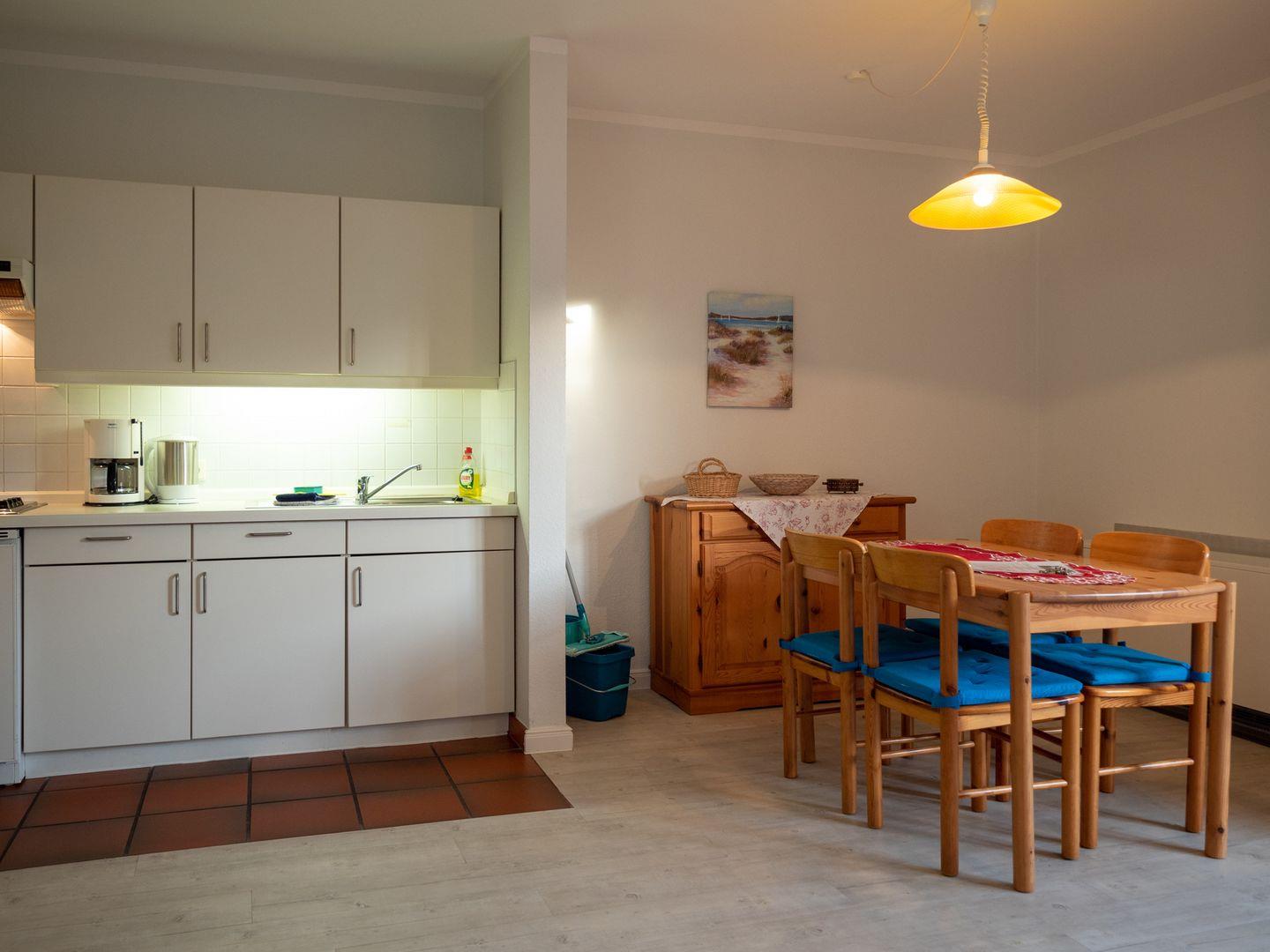 Das Apartment befindet sich im Erdgeschoss und bietet mit seiner überdachten Terrasse und dem angrenzenden Garten einen angenehmen Rückzugsort zum Entspannen. Besonders an sonnigen Tagen lädt der Außenbereich dazu ein, die klare Inselluft zu genießen. Die Unterkunft verfügt über ein separates Schlafzimmer mit einem Vinylboden, der ebenso wie der Belag im Wohnzimmer ideal für Allergiker ist. Im Wohnbereich erwartet Sie eine gemütliche Sofaecke mit Sessel, Kabel-TV und ein stilvoller Essplatz. Die offene Küche ist in den Wohnraum integriert und umfassend ausgestattet: Ein 4-Platten-Herd, Kühlschrank mit Gefrierfach, Kaffeemaschine, Wasserkocher, Toaster, Geschirr- und Küchenutensilien sowie ausreichend Besteck stehen zur Verfügung. Für die alltägliche Versorgung sind Geschirrhandtücher, Handtücher und Bettwäsche ebenso wie ein Staubsauger vorhanden. Bei Bedarf können Waschmaschine und Trockner gemeinschaftlich genutzt werden.