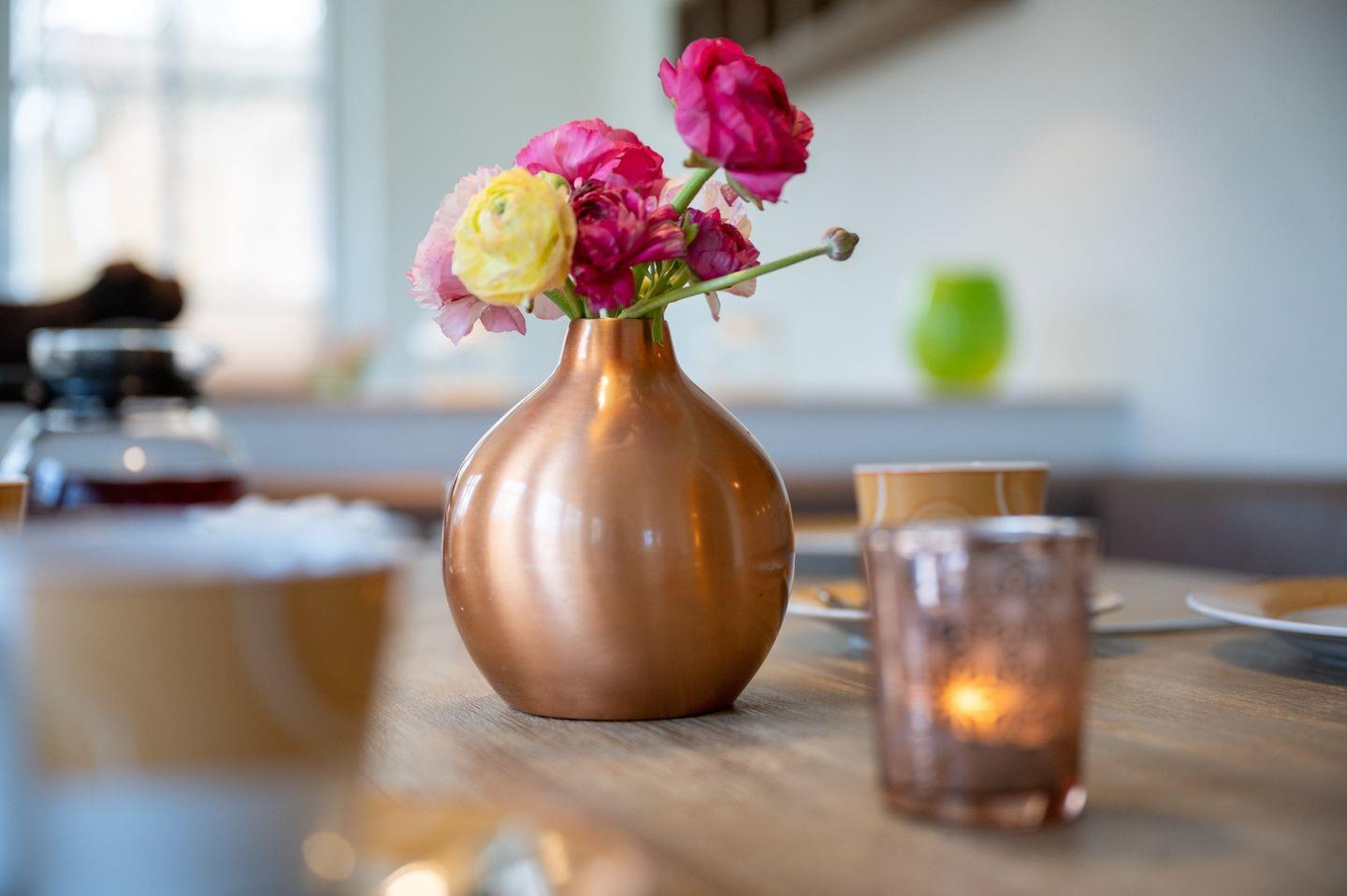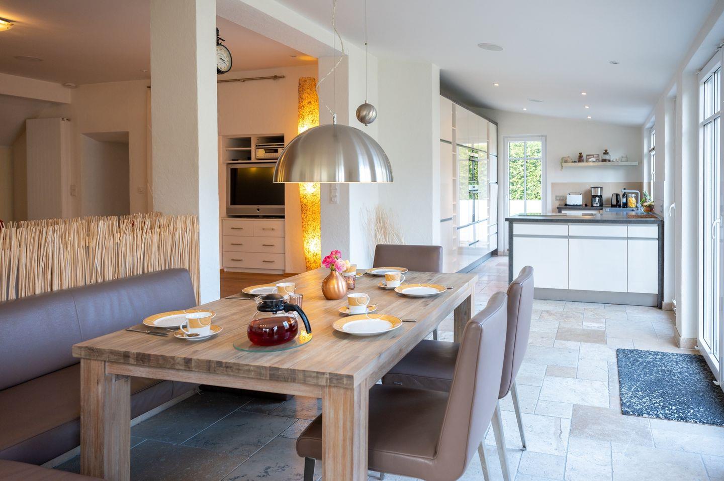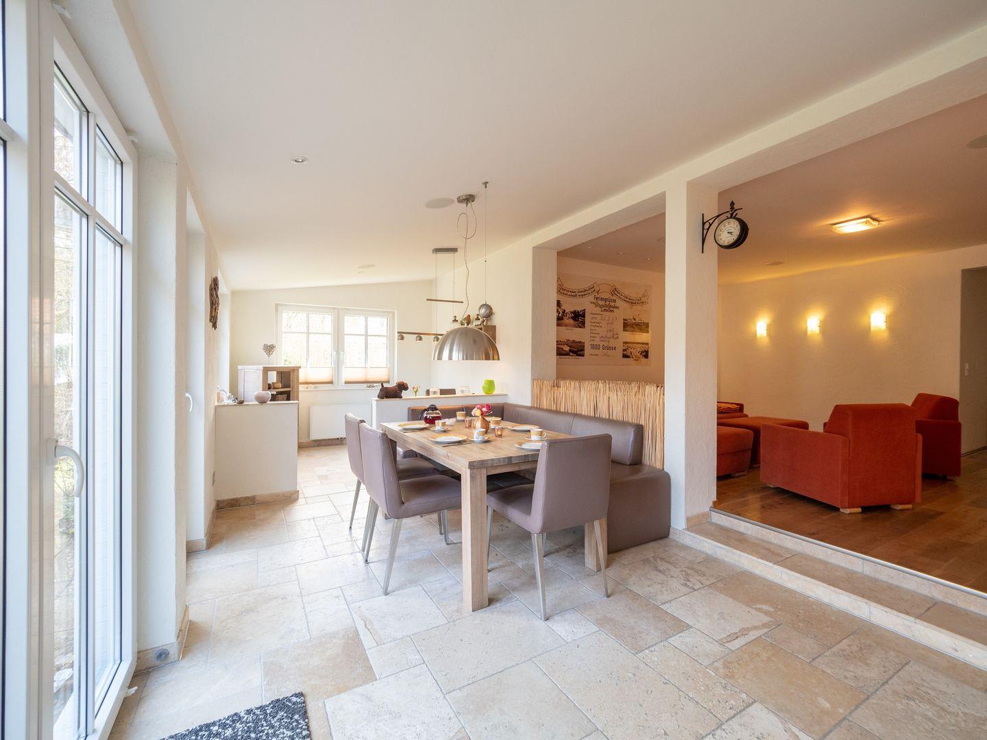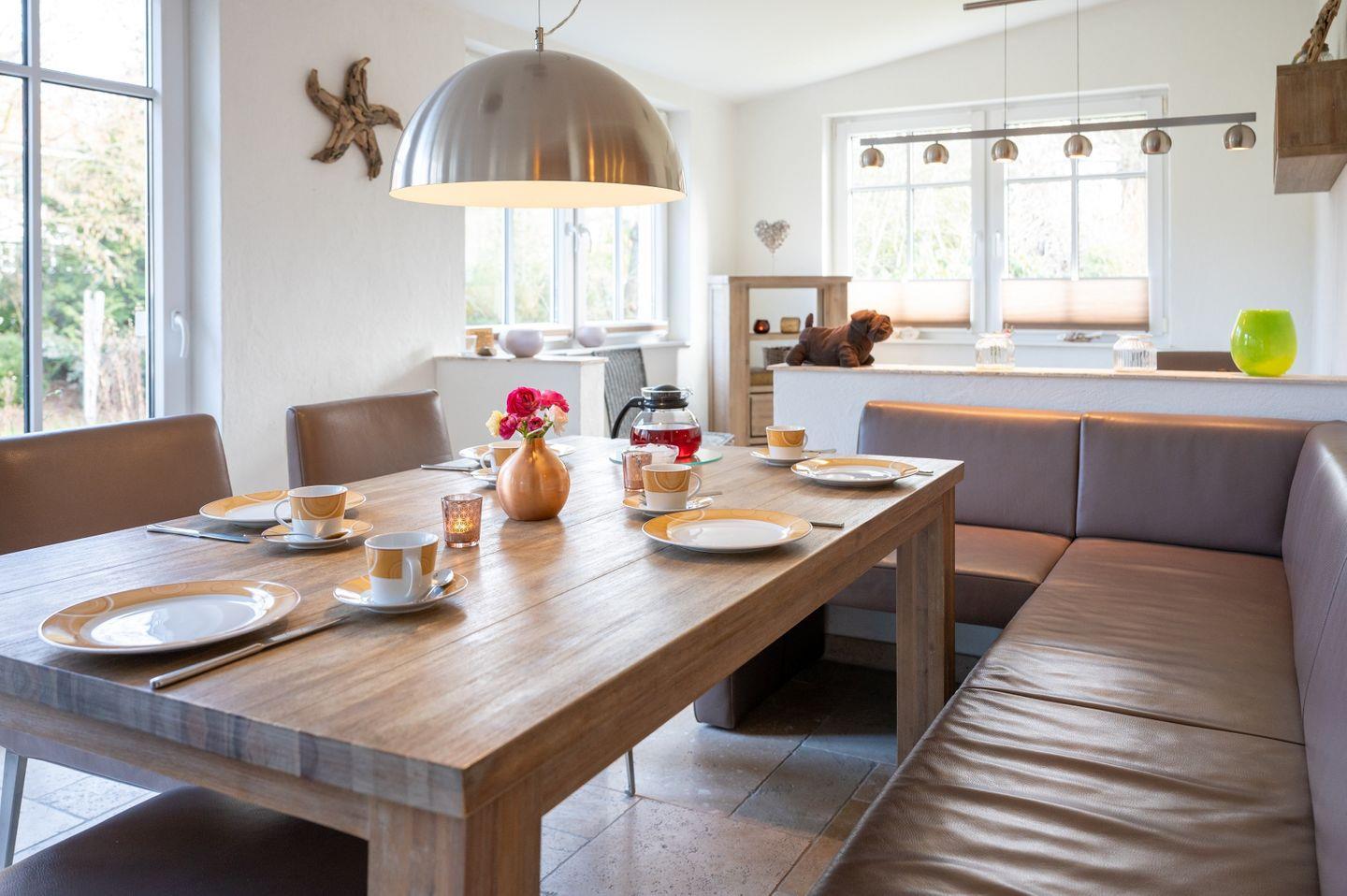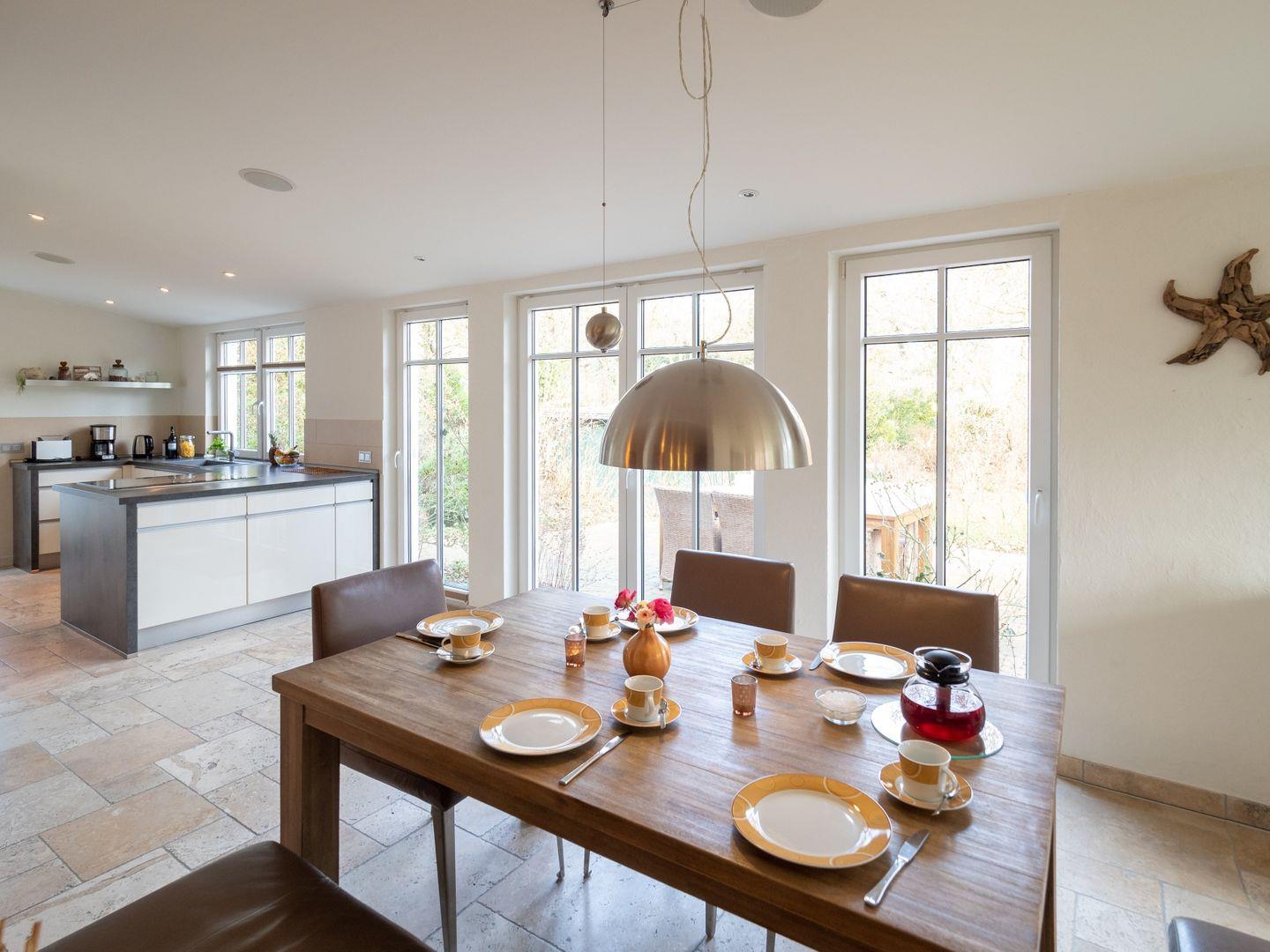In allen Schlaf- und Wohnräumen ist ein ölimprägnierter Dielenfußboden verlegt. Der Ess-, Küchen- und Arbeitsbereich ist mit einem besonderem Natursteinfußboden und zusätzlicher Fußbodenheizung ausgestattet und strahlt wohnliche Wärme aus. Von hier haben Sie den direkten Zugang zu der meist sonnigen Terrasse und dem herrlichen Garten. Die Wohnung ist mit allem ausgestattet, was Sie für einen erholsamen Inselurlaub benötigen und lassen Sie zu jeder Jahreszeit wunderschöne Tage auf dieser besonderen ostfriesischen Insel erleben.