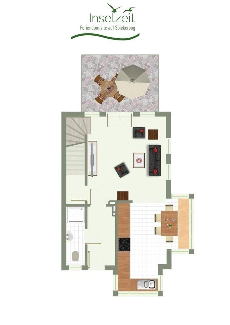 Der helle und hochwertige Wohn-, Ess- und Küchenbereich strahlt Gemütlichkeit aus. Auf der Terrasse, die Sie vom Wohnbereich aus erreichen, finden Sie Liegestühle und Teakmöbel. Die moderne und funktional eingerichtete Küche mit Ceranfeld, Backofen, Mikrowelle, Spülmaschine, Kaffeemaschine und reichlich Geschirr und Besteck bietet allen Komfort. Wlan, HD-Flachbildschirm und Musikanlage stehen bereit. Neben der Haustür befindet sich eine Toilette mit Duschbad.