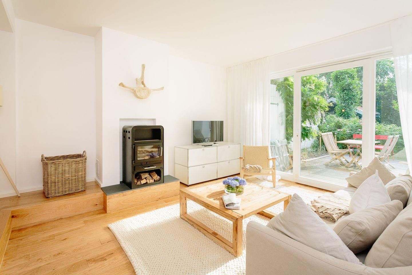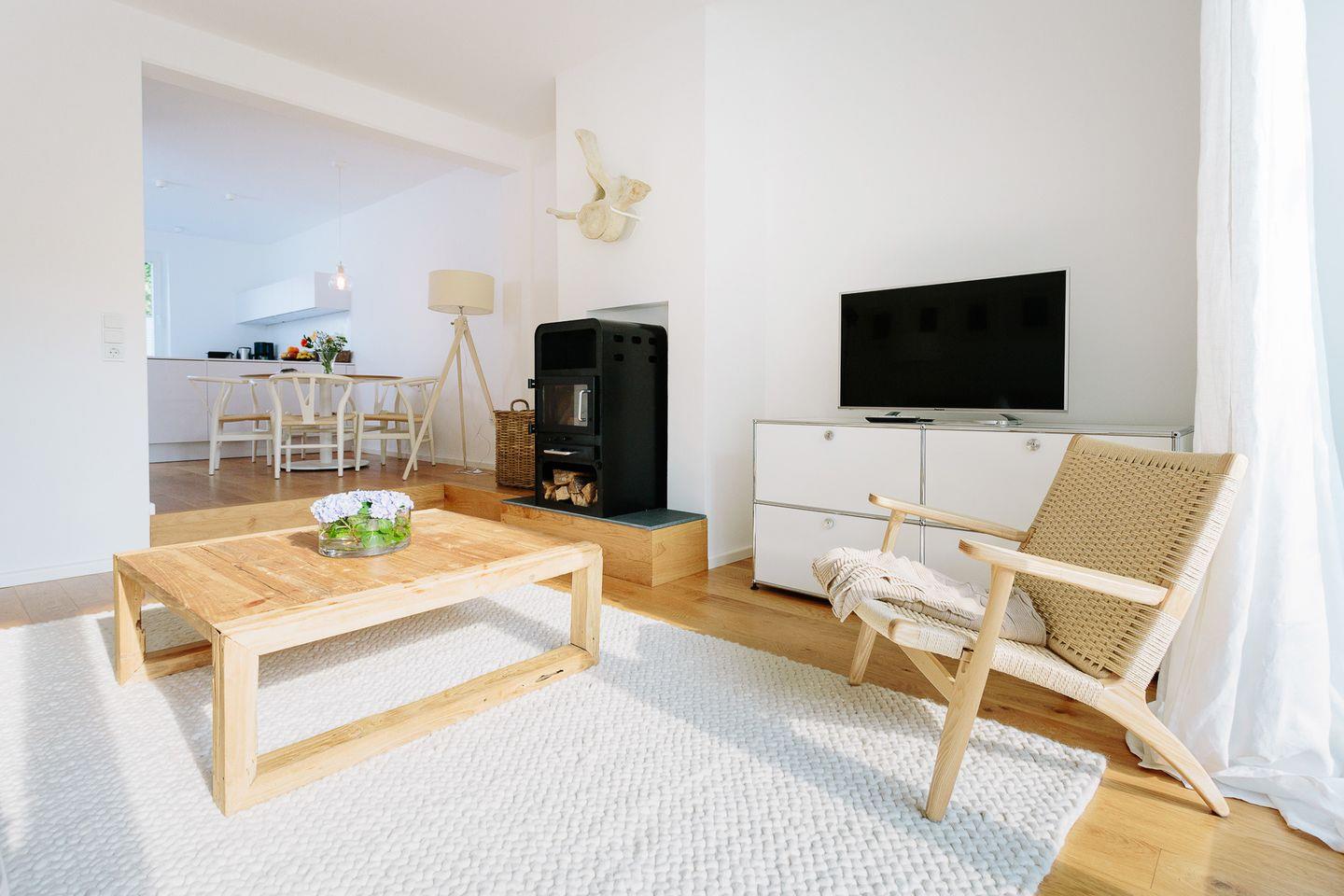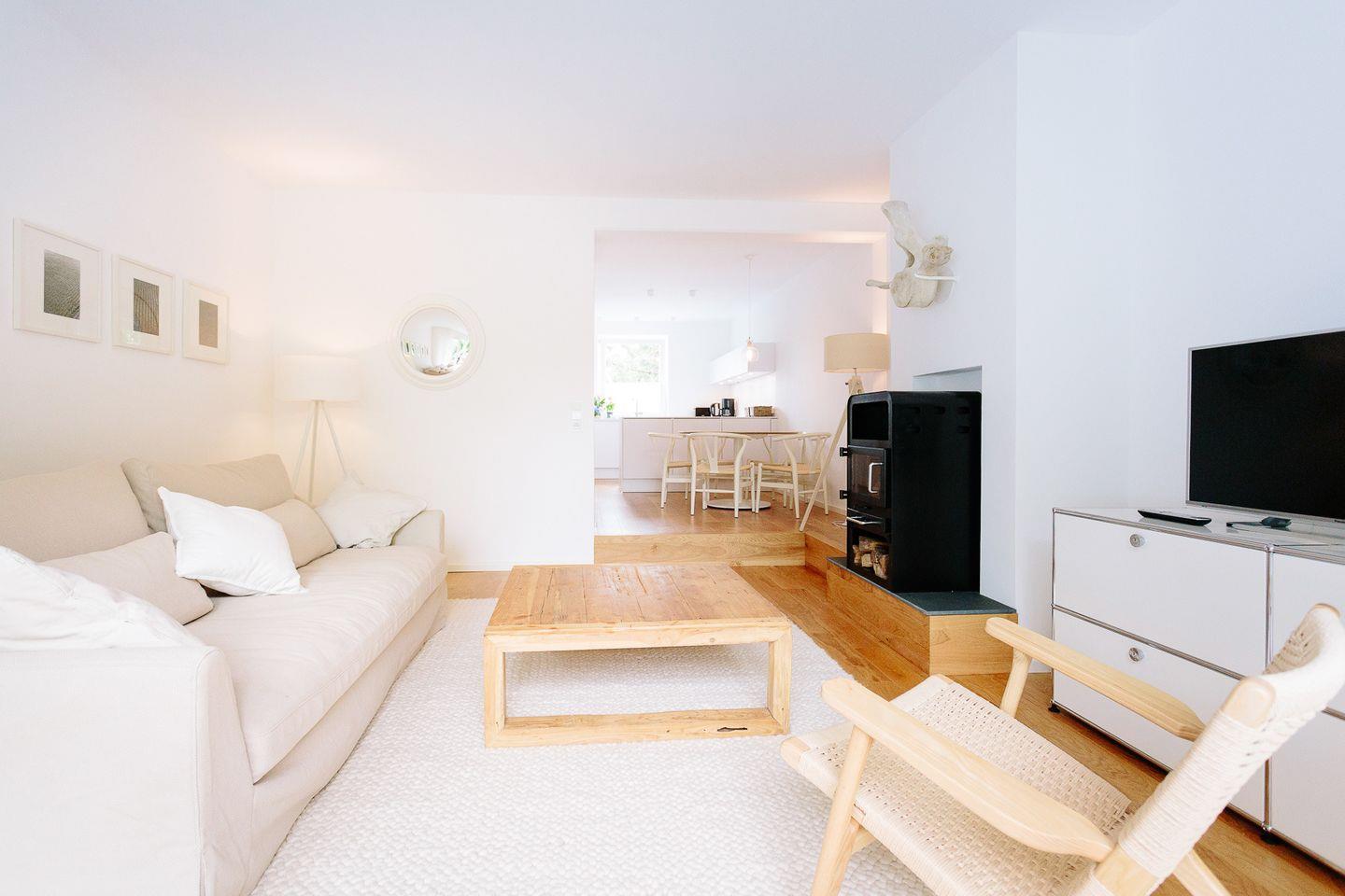 Das geräumige Wohnzimmer mit hochwertigen Möbeln nimmt die sanfte skandinavische Wohlfühlatmosphäre auf, so dass auch an regnerischen Tagen kein Gefühl von Enge aufkommt.