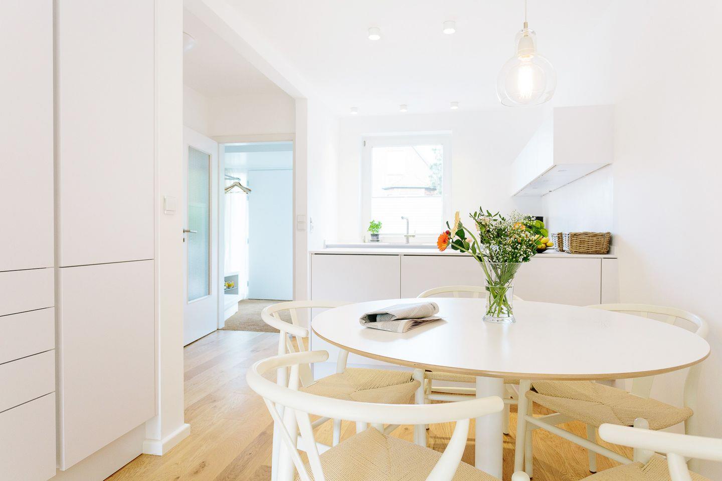 Im Erdgeschoss wartet ein großzügig geschnittener, sonniger Wohn-Essbereich auf Sie. Der Essbereich ist mit bequemen skandinavischen Stühlen ausgestattet und sorgt für entspannte Morgenstunden im Kreise der Familie und Freunde.