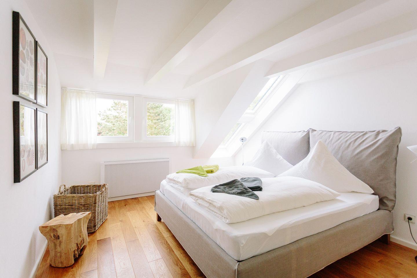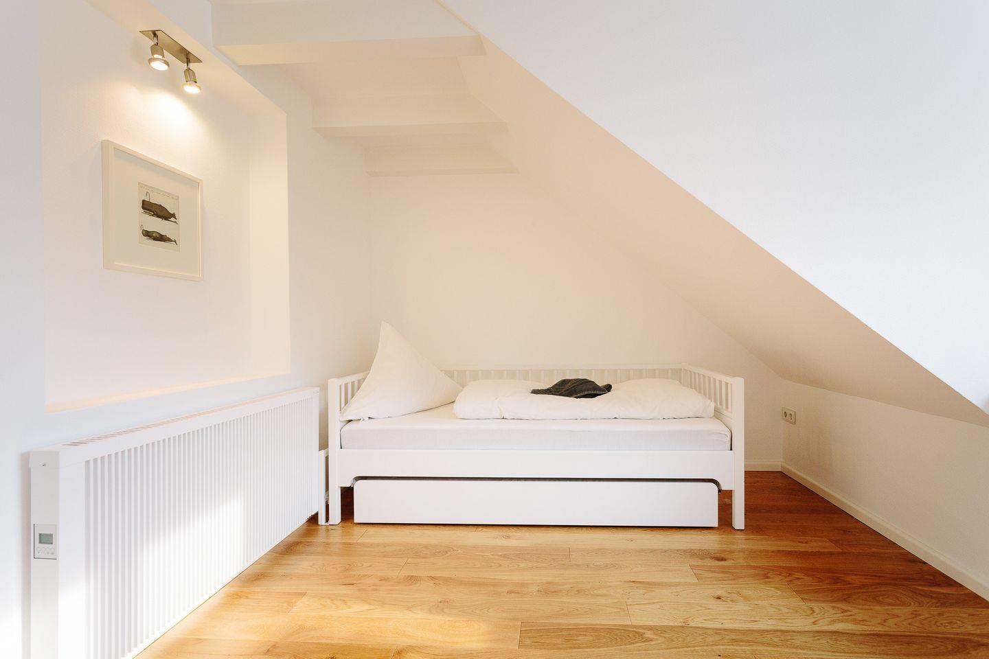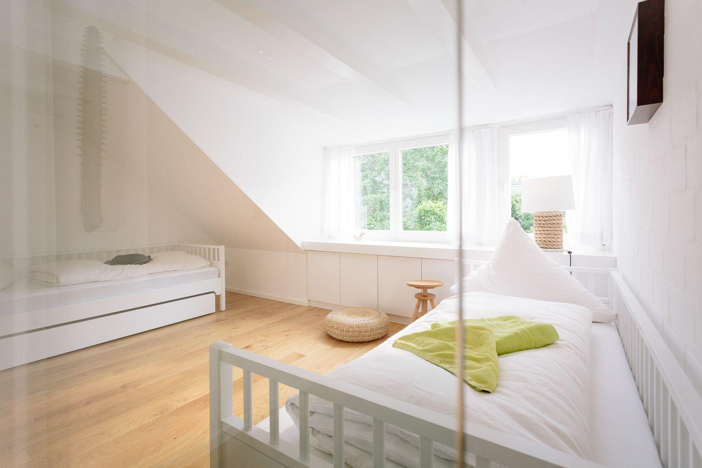 Im Obergeschoss befinden sich zwei helle und freundliche Schlafzimmer, von denen das eine Schlafzimmer mit einem gemütlichen Design-Doppelbett ausgestattet ist. Im daneben liegenden zweiten Schlafzimmer können wahlweise zwei Kinder oder Erwachsene in erstklassigen skandinavischen Einzelbetten übernachten. Zusätzlich steht für ein weiteres Kind ein herausziehbares Bett zur Verfügung. Ein Gitterbett stellen wir bei Bedarf gerne bereit.