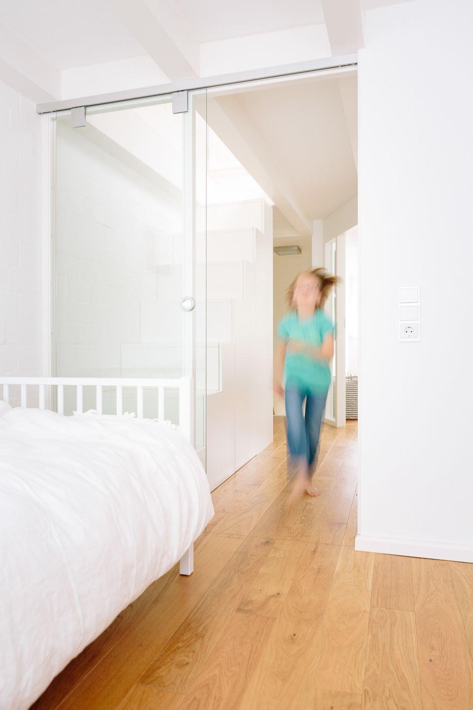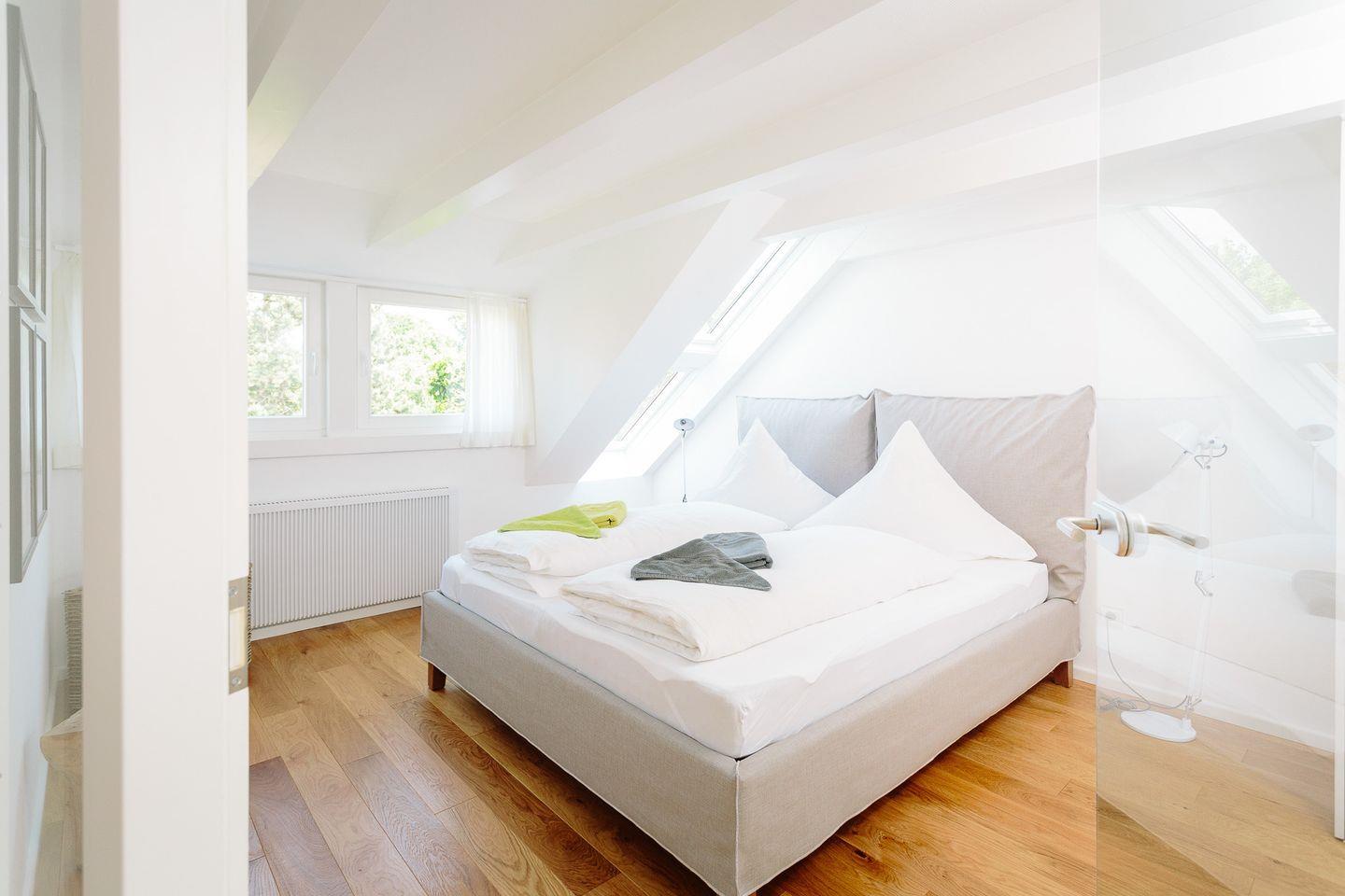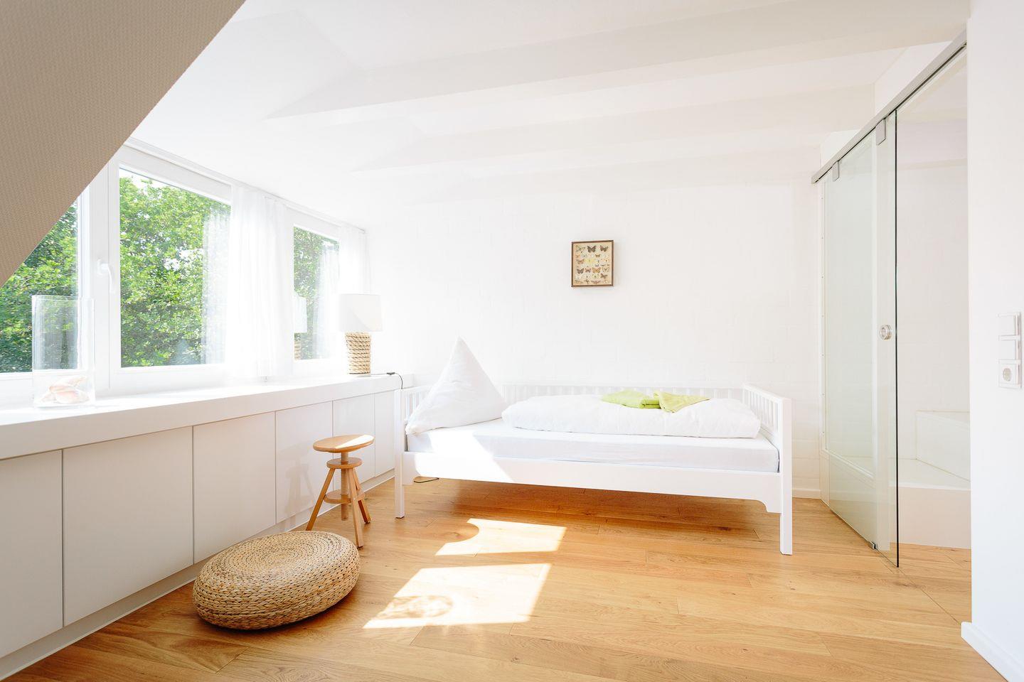 Im Obergeschoss befinden sich zwei helle und freundliche Schlafzimmer, von denen das eine Schlafzimmer mit einem gemütlichen Design-Doppelbett ausgestattet ist. Im daneben liegenden zweiten Schlafzimmer können wahlweise zwei Kinder oder Erwachsene in erstklassigen skandinavischen Einzelbetten übernachten. Zusätzlich steht für ein weiteres Kind ein herausziehbares Bett zur Verfügung. Ein Gitterbett stellen wir bei Bedarf gerne bereit.